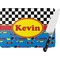 The top of this design is the classic black and white checks. The bottom half of this pattern screams drag racing with cars in red, yellow and orange interspersed with racing flags on a blue background. A yellow trimmed red ribbon and a yellow oval label tie the design together. Personalized with the name of your choice will bring a smile to your racer.
