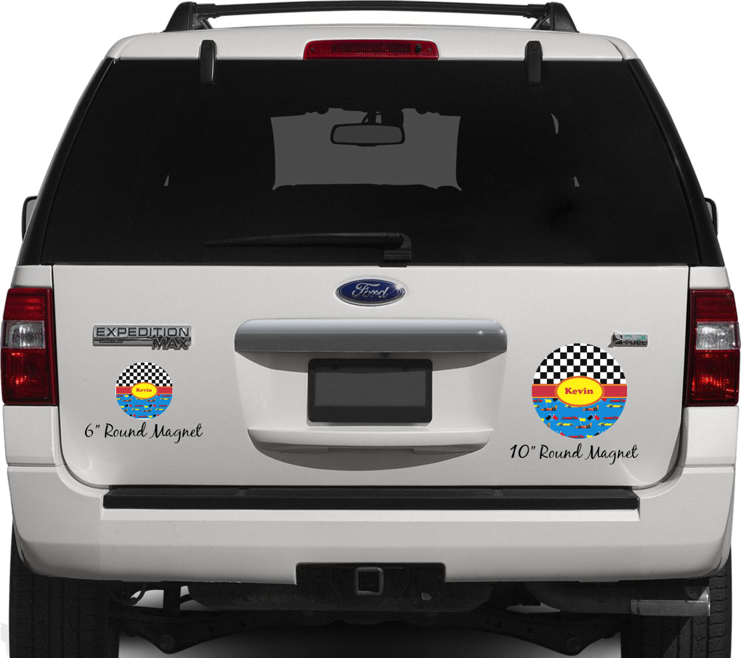 Your personalized car magnets are available for purchase in two shapes and two sizes. We carry round and square editions; each shape can either be 6 by 6 inches, or 10 by 10 inches, depending on your needs. Both versions are 1 millimeter thick, which is considered, within the industry, as the ideal thickness for automobile magnets. The magnetic car decals will adhere to any smooth, metal surface of your cars body, such as the trunk door or a side panel. However, please note that some vehicles are constructed from fiberglass bodies, which prevents the adhesion of anything magnetic. We advise that you test your vehicle before purchasing these magnets.