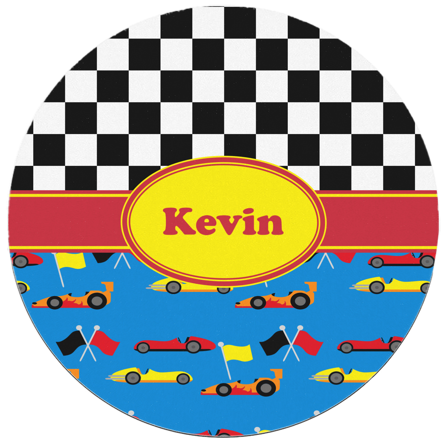 The top of this design is the classic black and white checks. The bottom half of this pattern screams drag racing with cars in red, yellow and orange interspersed with racing flags on a blue background. A yellow trimmed red ribbon and a yellow oval label tie the design together. Personalized with the name of your choice will bring a smile to your racer.