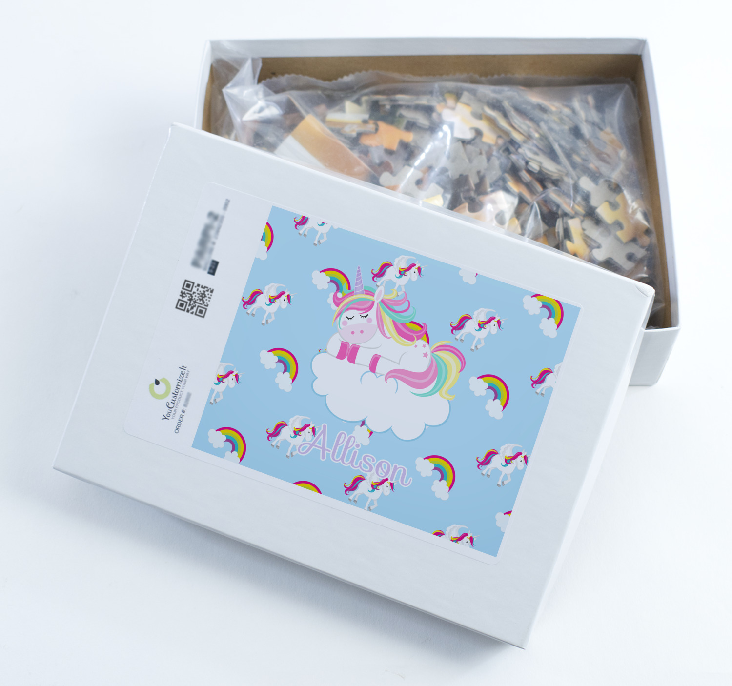 We print our puzzles on thick white chipboard in vibrant colors, then laminate the chipboard and die cut your puzzle. Your jigsaw puzzle is shipped to you in a box with the image of the puzzle on the box.