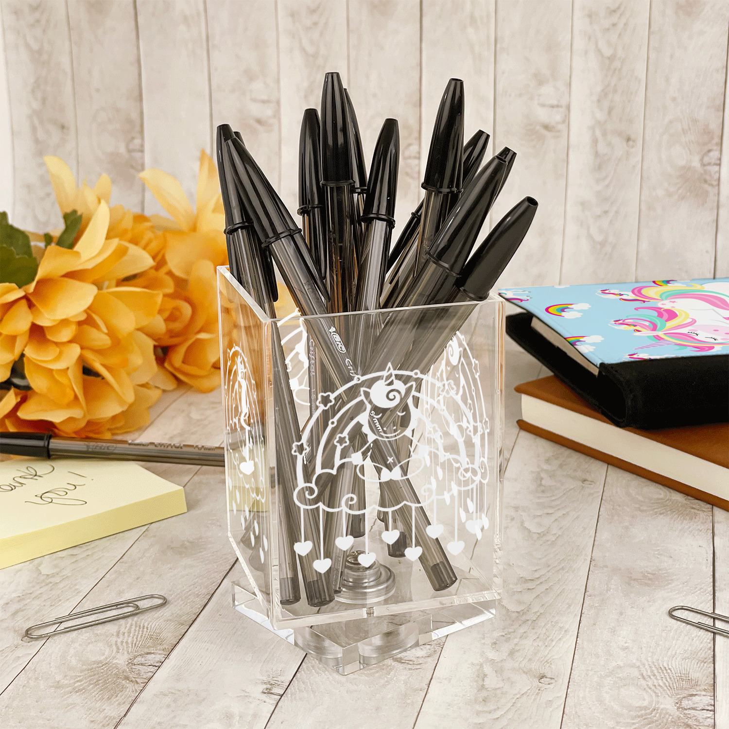 Add a great accessory to your desk with one of these acrylic pen holders. A great way to store your writing utensils, and personalized to suit your needs.
