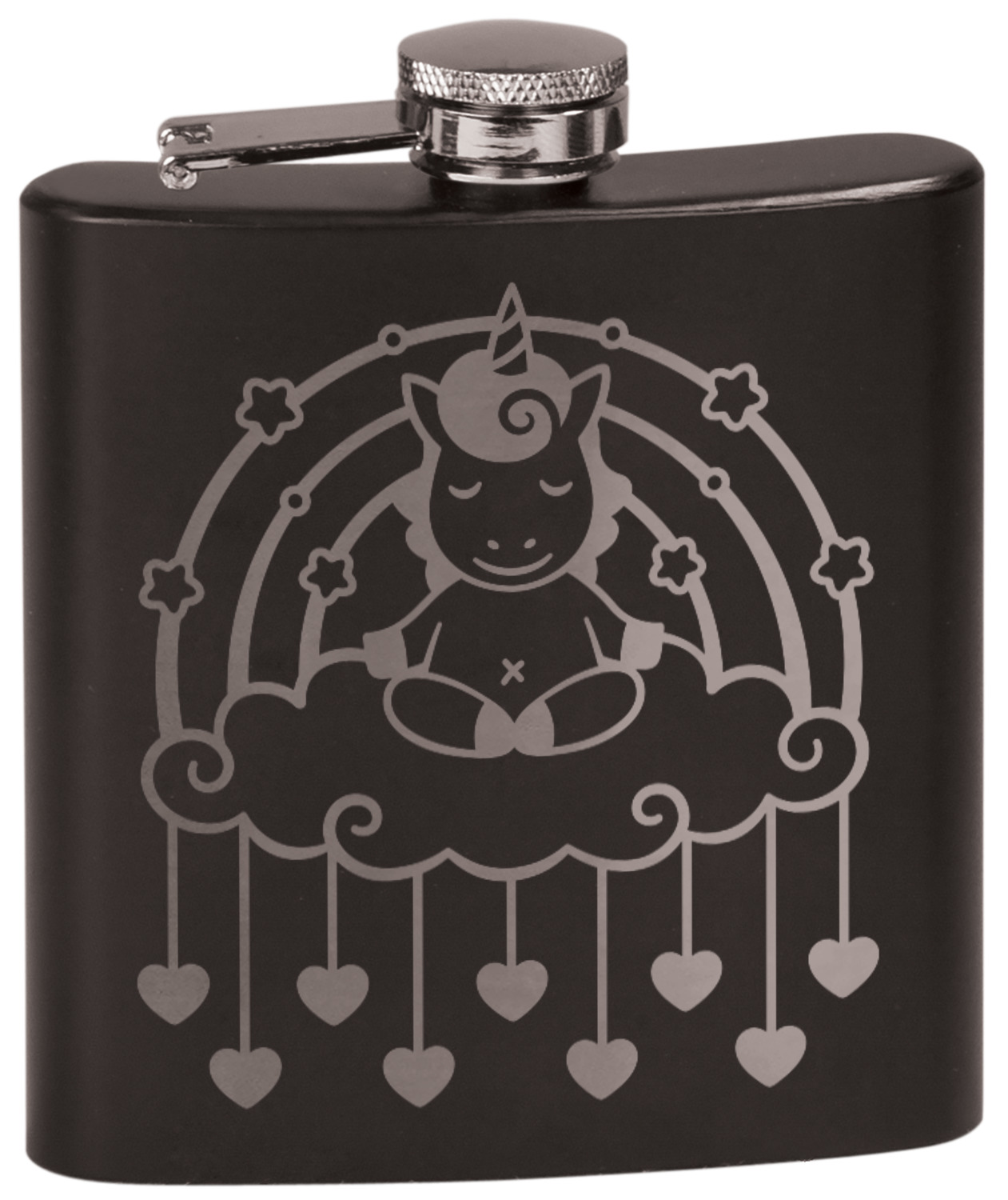 Built from a stainless steel and then covered with a black coating, this hip flask, has a very classy appearance. Similar to the standard flask, this stainless steel flask has the traditional curved shape for a snug fit in your palm. This flask set also includes a traditional screw and flip lid and liquid funnel in a gift box. At 4 by 4.5 inches, this flask can hold up to 6 ounces. Your personalized design is laser-engraved across the front of this flask.
