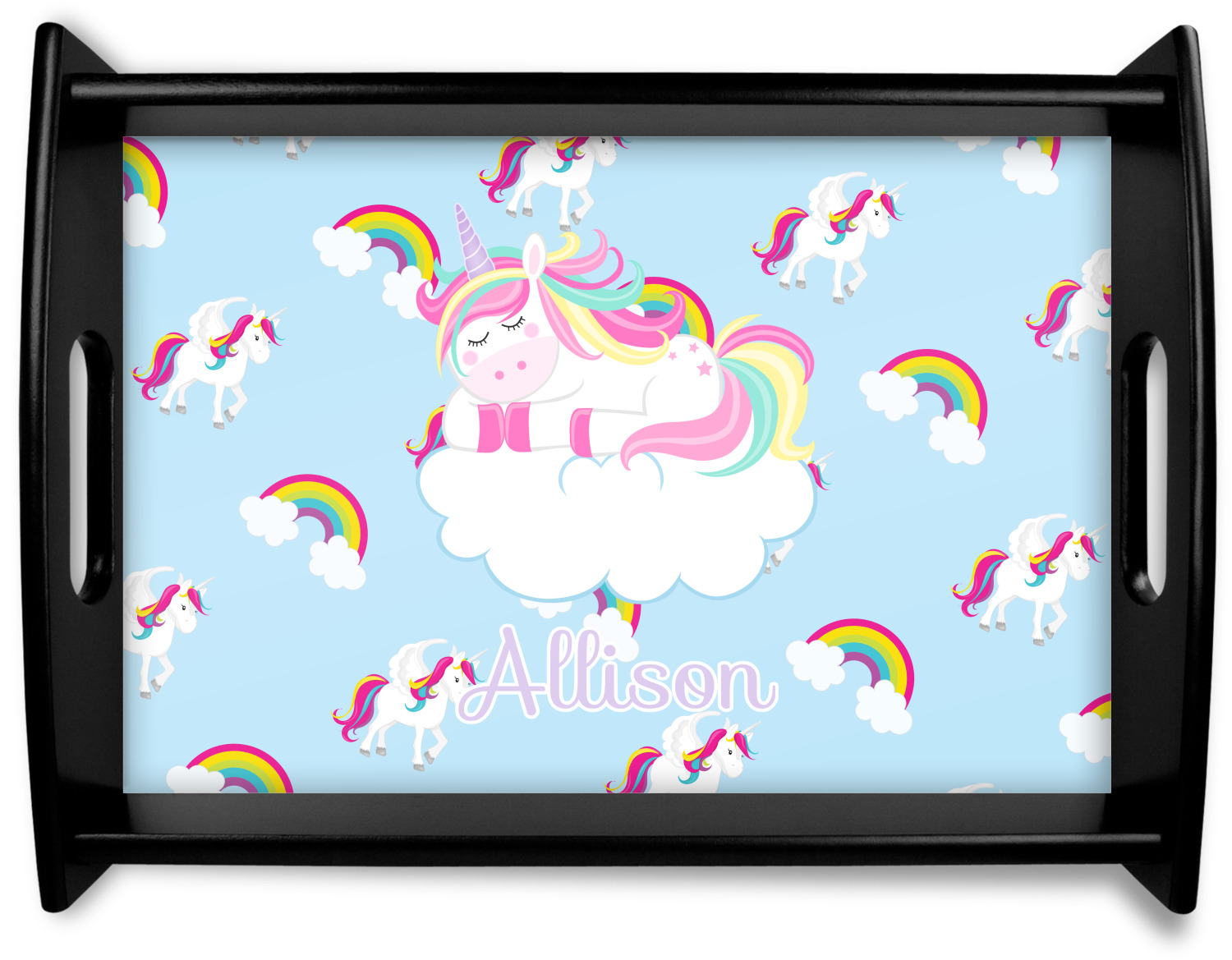 This serving tray with handles features square edges and two rounded sides, creating a very modern look. Each side is fabricated from a beautifully cut, natural wood. The bottom of the interior of the tray displays your customized design in bright, vibrant color. The tray is sold in both a black color and a natural wood look. Each variation of the wood serving tray has two sizes: Small, which is 14" x 10" x 2.25", and Large, which is 19.5" x 13.5" x 2.75".