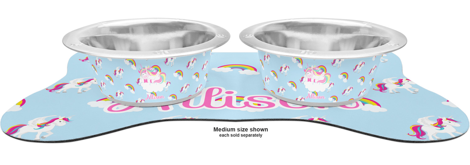 The top of this mat displays your custom design, as it is printed on polyester. To prevent slippage, the underside of the mat is made of rubber. We offer a small dog food mat, suitable for smaller dogs and a large dog food mat for bigger breeds. The small dog food mat is approximately 19 by 13 inches, while the large dog feeding mat measures at approximately 26.75 by 18 inches. Both personalized mats are ideally sized to fit two dog bowls.