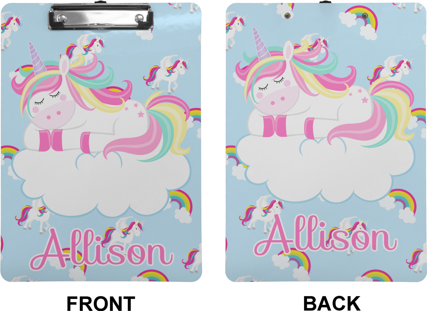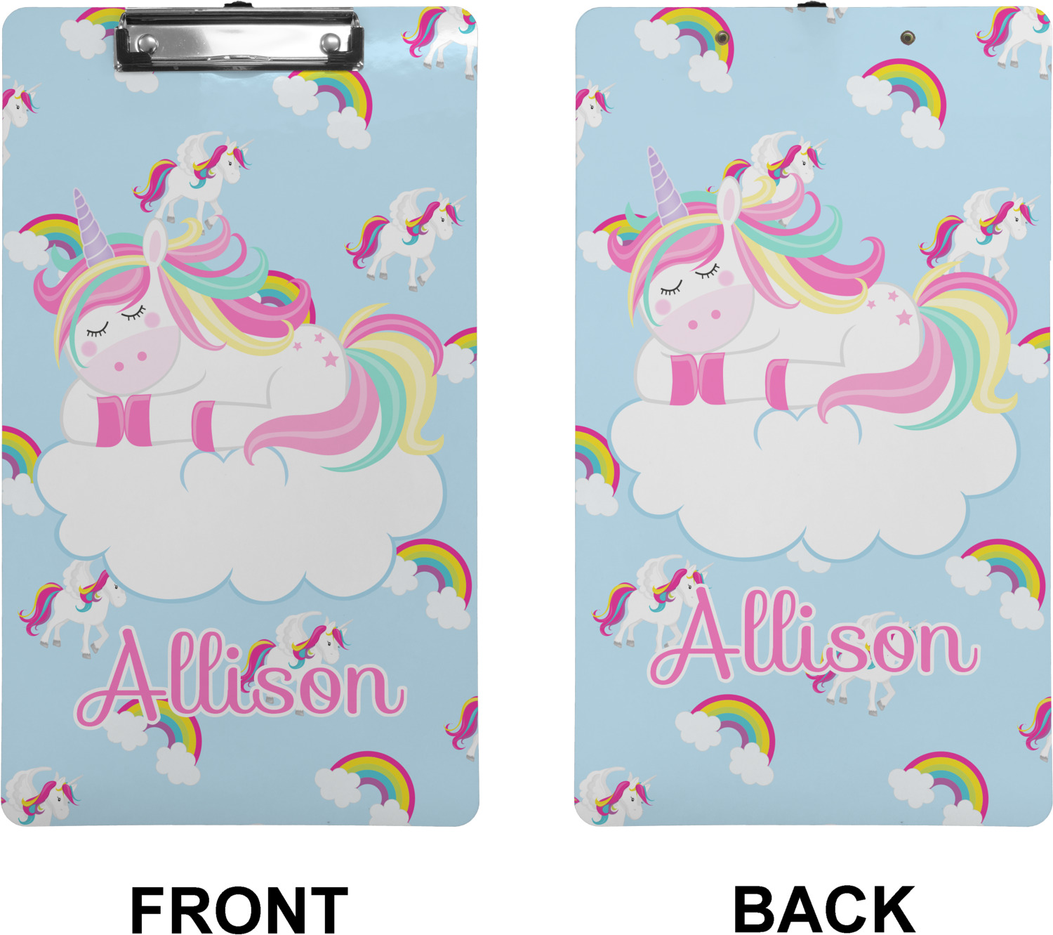 These custom clipboards are made from a strong hardboard and are coated with a glossy finish that accentuates the colors of your design. Alongside a retractable hook at its top, these decorative clipboards also feature sturdy clips to secure several sheets of paper. We sell these clipboards in two separate sizes. Our letter size measures at 12.5" L x 9" W, while our legal clipboard is approximately 15.5" L x 9" W. On both models, your personalization is printed on both sides of this clipboard and can be customized individually.