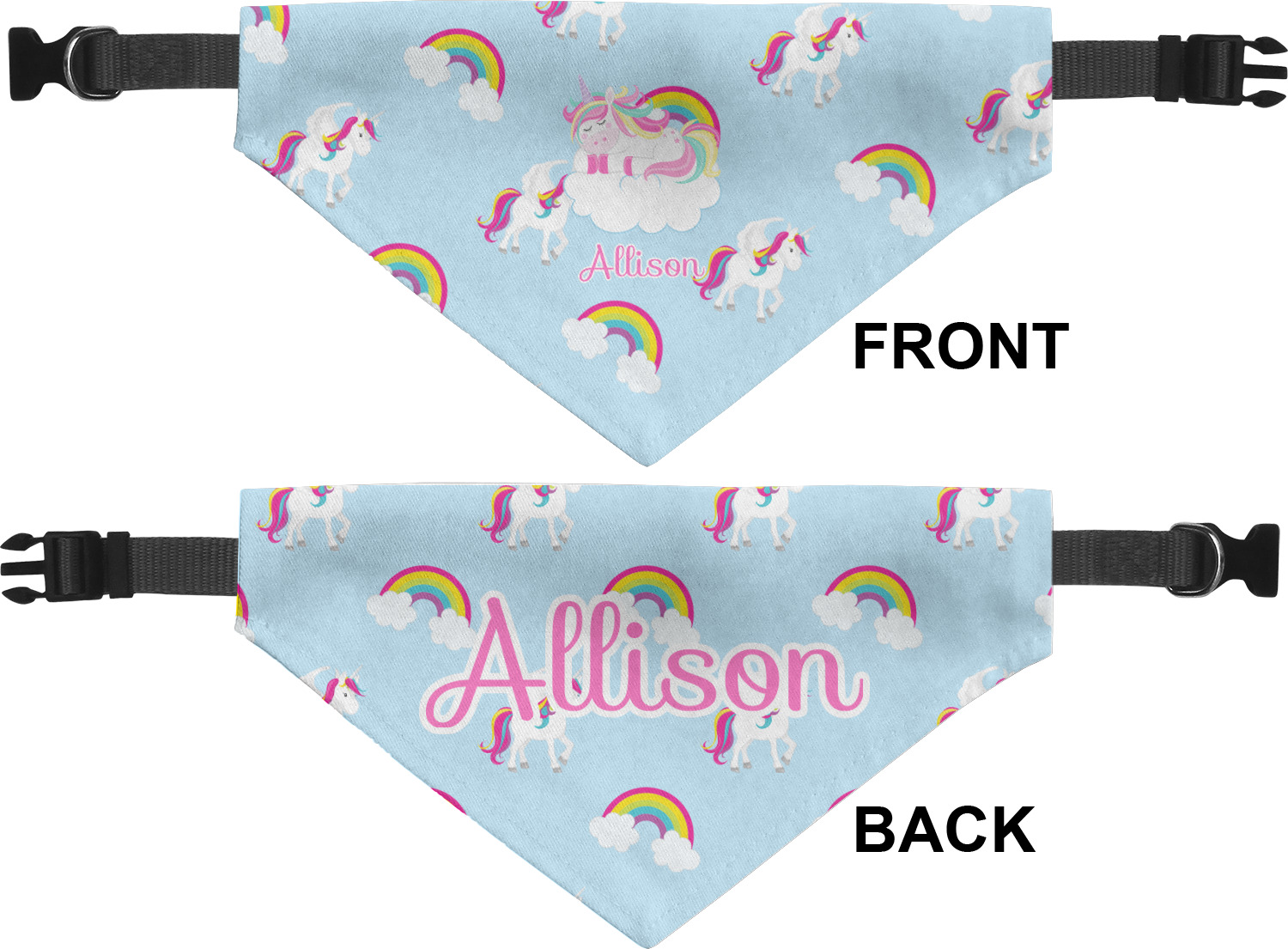 We print the front and back of these dog bandanas with your customized design. The bandana itself is made from a durable polyester, sewn together with a gap large enough to accommodate any collar. Regardless, the bandana includes a plain black, canvas collar with plastic snaps, that can easily be removed if desired. These dog bandana collars are available in four sizes: small, medium, large, and extra large. Please see our sizing chart for more information regarding the dimensions of each size.