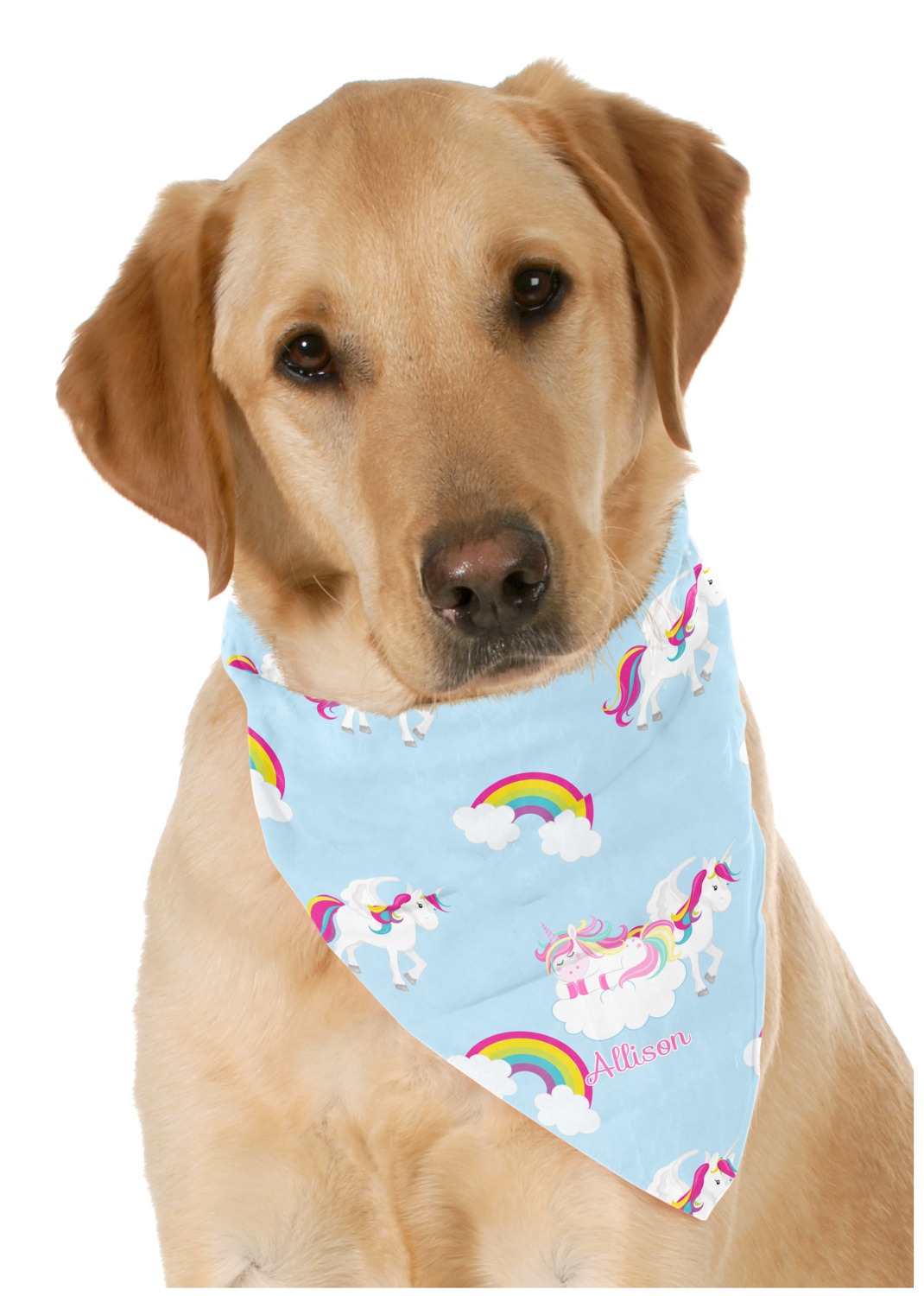 This beautiful pet bandana really is the perfect accessory. It is made from a silky feeling polyester and measures at approximately 23" x 23". Your personalization will be printed on a diagonal, so that you are able to read the personalization when folded into a triangle. This bandana fits best on large dogs, but can be folded smaller if there is no personalized text to fit smaller pets.