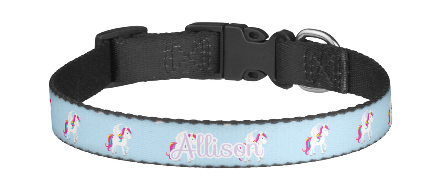 This sturdy collar, made from a durable nylon weave, will outlive your dog's episodes of excited tugging and pulling. Courtesy of its thick plastic buckle and adjuster, this collar is adjustable and accommodating of any dog. Structurally, the collar is a single piece of nylon weave that is sewn together, and features a solid metal loop where you can attach a leash or dog tag. We print and display your dog's name and pattern across the middle of the personalized dog collar.
