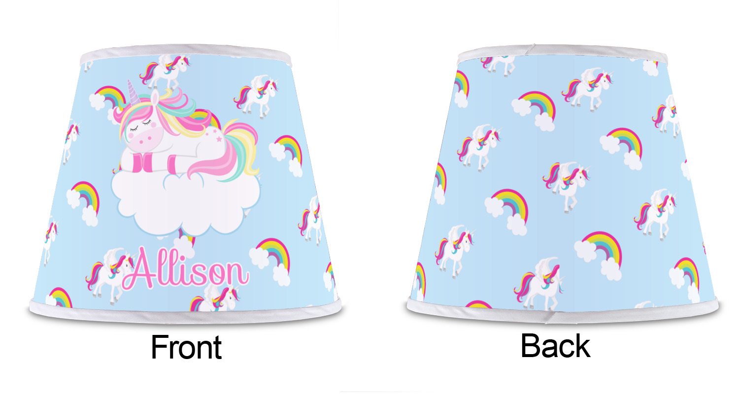 The base of this lampshade is 12 inches in diameter, and the top spans 8 inches in diameter. The total height of the lampshade is 10 inches. The angled nature of this custom lampshade concentrates the light, making it ideal for smaller spaces. This lampshade is made of matte, polyfilm, and displays your customization in its middle. The top and bottom of this colorful lamp shade are lined with a white fabric ribbon (which can be replaced with black inside the design studio) which frames your design and creates a sophisticated finish. As an UNO fitter lampshade, this unique lamp shade will fit a variety of bases.