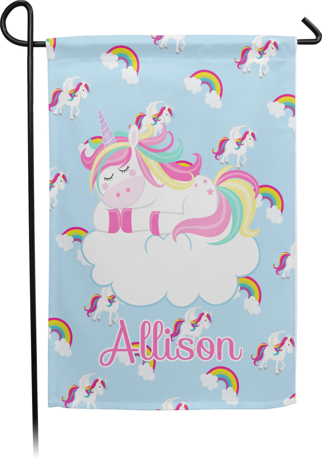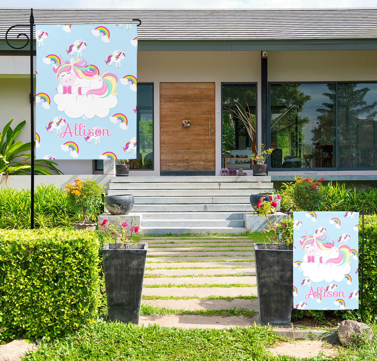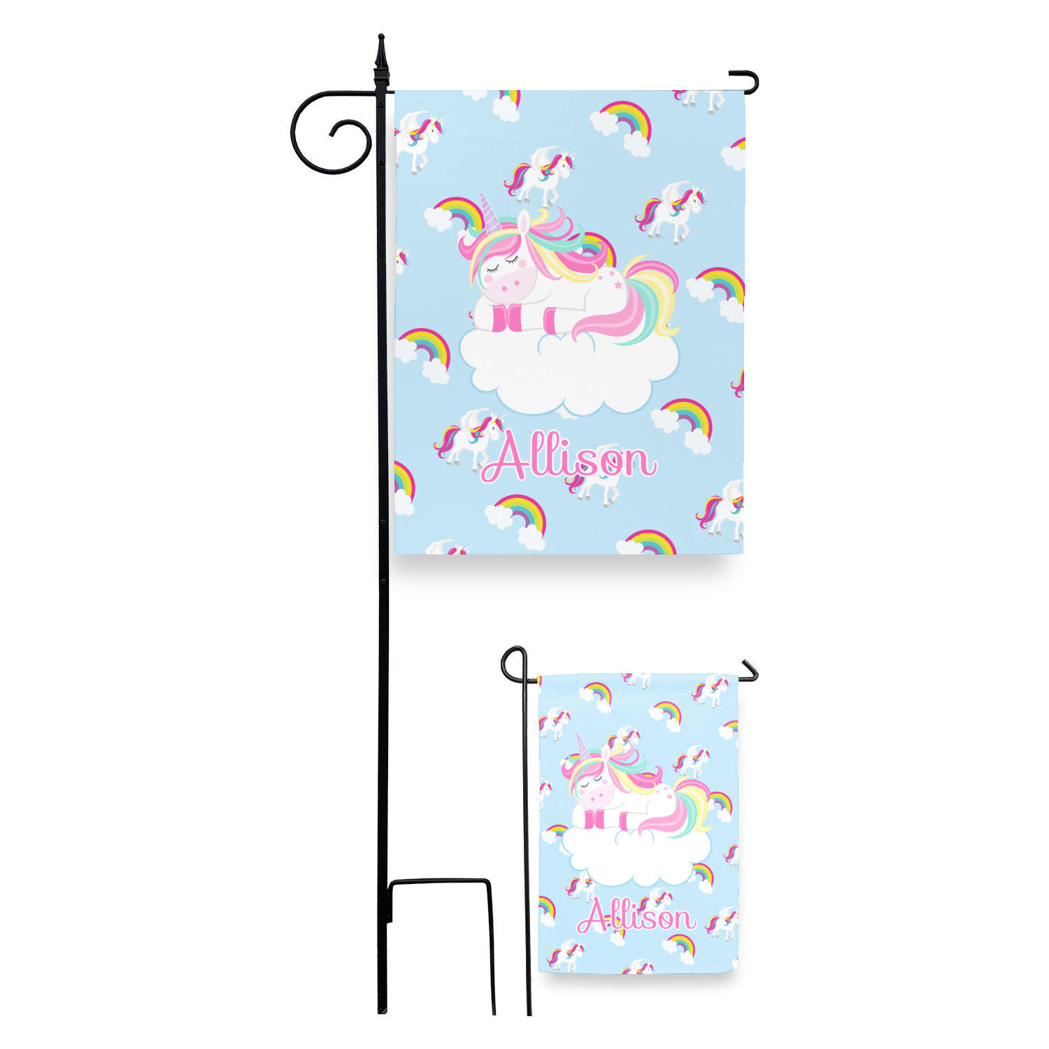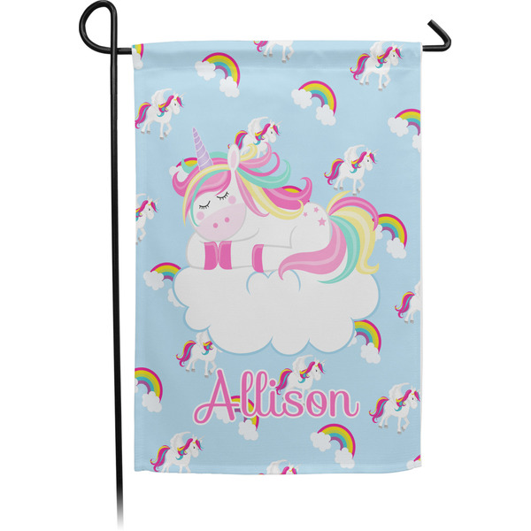 These custom garden flags are made of a durable, double-ply, polyester weave, allowing them to withstand the elements year round. The small flags measure at approximately 12 by 18 inches. The large flags measure out to 28 by 37 inches. You can order these decorative flags with your customization printed on the front only, or the front and back.