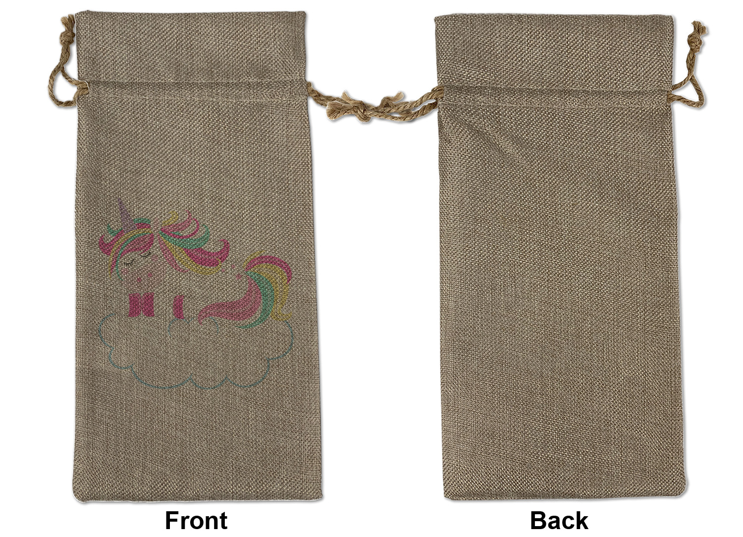 We sell our Burlap Gift Bags in 3 variant sized bags. Made with burlap polyester, each personalized bag can be secured with a twine drawstring pull. Your custom design is available to print on one side or both sides - completely up to you! The sizes of the bags measure approximately 4.5" x 6.5" for the smallest size, 6.5" x 8.0" for the medium size, and 6.5" x 13.5" for the large-sized bag.