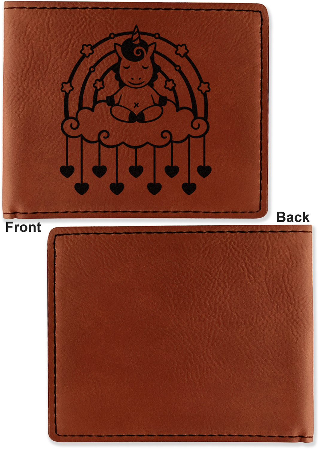 Your bifold wallet will be personalized by laser engraving, which will be a black color on the wallet. Choose a graphic, text, or monogram to personalize your wallet. There are thousands of choices in our design center.