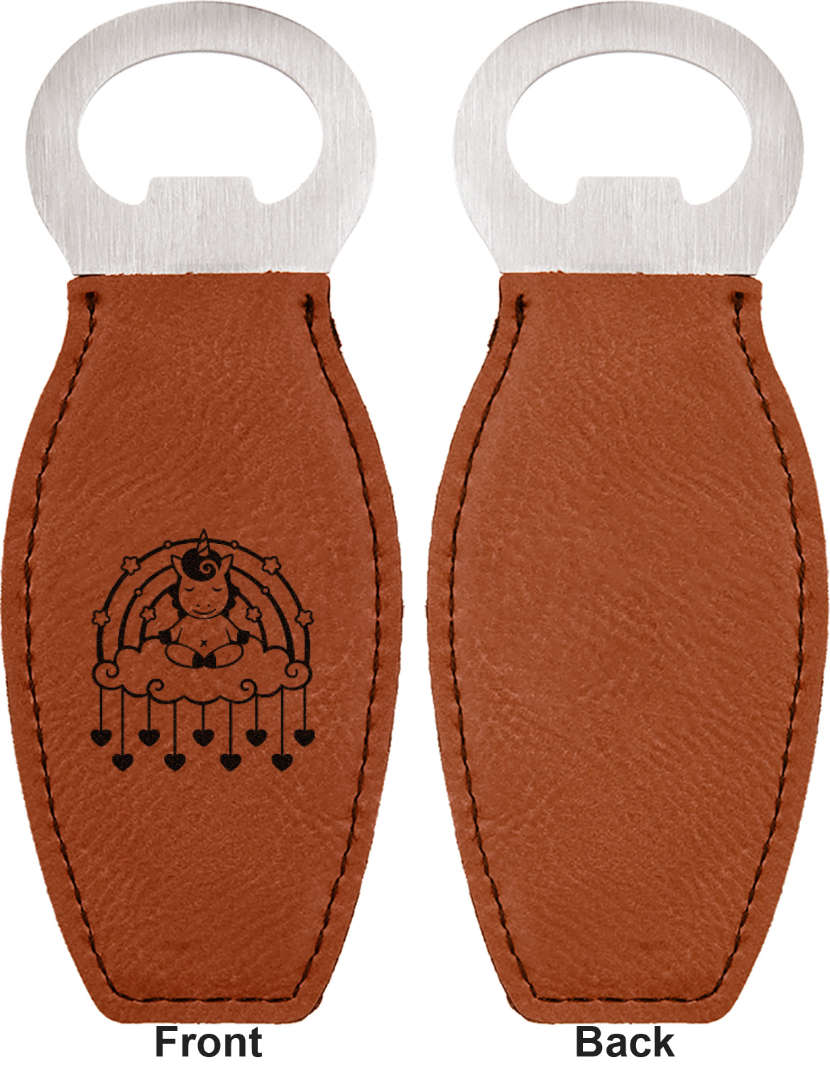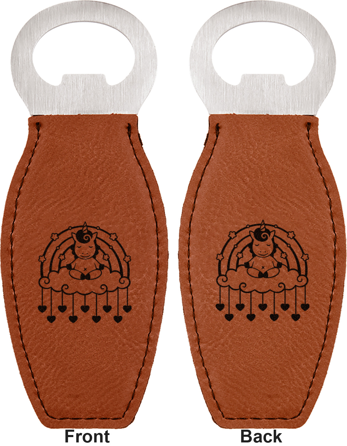Built from stainless steel, these custom bottle openers are wrapped in a cognac-colored leatherette. Sharp, black stitching lines the edges for extra durability and a finished touch. Your personalization is laser-engraved onto the surface of this leatherette, leaving behind a crisp, black coloration. At 4.6 by 1.8 inches, this beer bottle opener gives you much of leverage when trying to open a stubborn bottle. On the opposite end of the opener, you'll find a magnet that you can use to display your new, unique bottle opener!