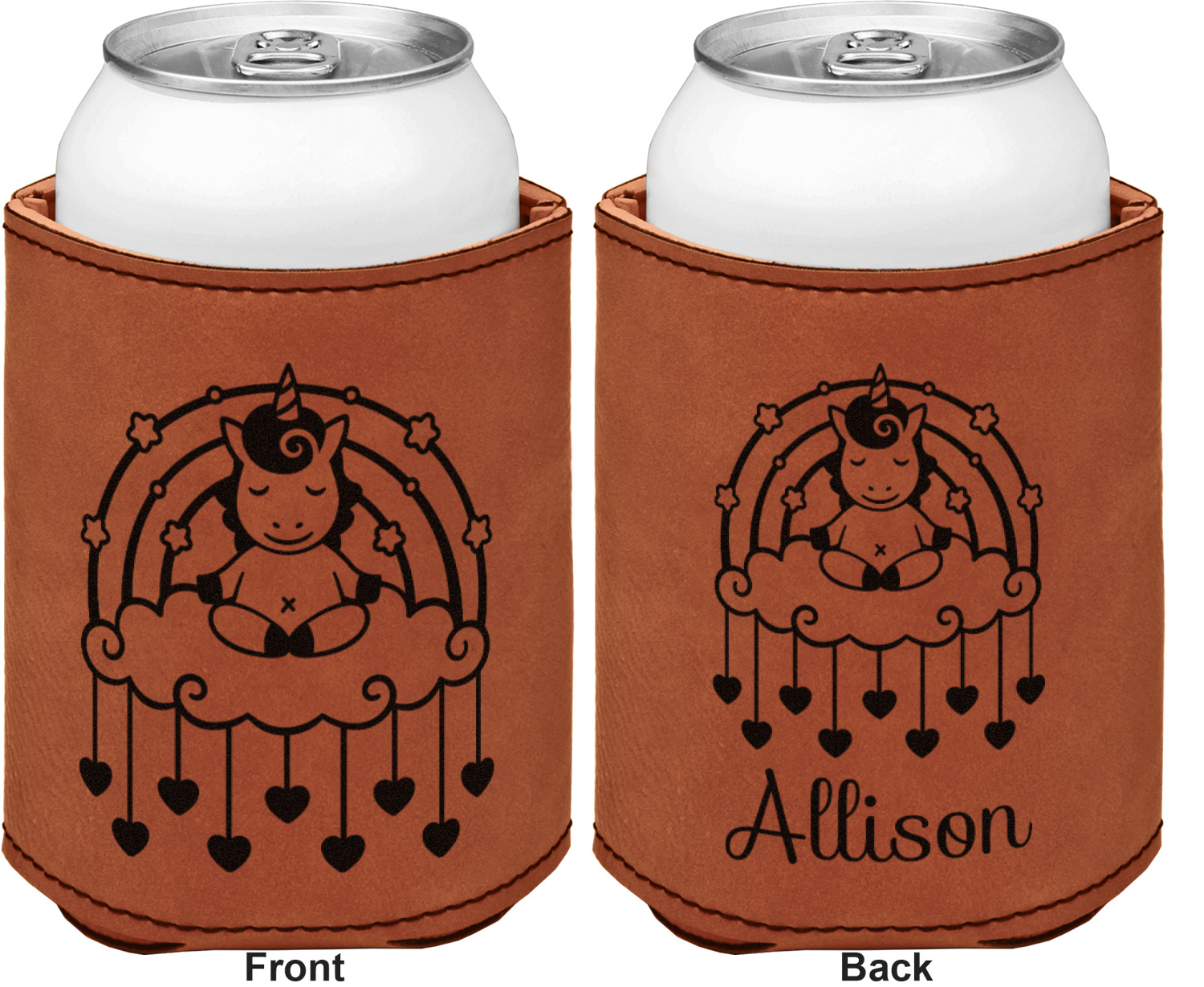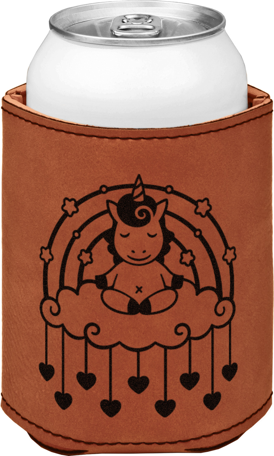 This can sleeve is made from a cognac-brown leatherette and stitched with a sturdy, black thread. A slim padding lines the inside of your can sleeve to allow for a better fit once your drink is inserted. The sleeve itself measures at 4 by 4.5 inches, allowing this custom can sleeve to accommodate most canned drinks. Your personalized design can be engraved on the front and back, or solely the front. When laser-engraved, your design appears as a black coloration which contrasts the leatherette nicely.