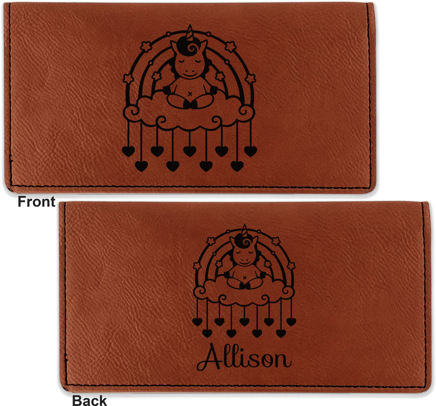 Go into our design center to start personalizing. Your checkbook cover will be laser engraved, making the graphic or text a black color. Choose a fun saying, monogram, or font to go on your checkbook cover. You have the opportunity to do it double or single sided.