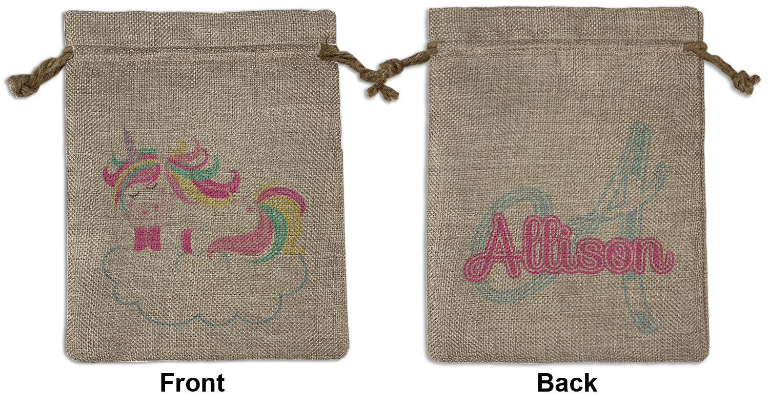 We sell our Burlap Gift Bags in 3 variant sized bags. Made with burlap polyester, each personalized bag can be secured with a twine drawstring pull. Your custom design is available to print on one side or both sides - completely up to you! The sizes of the bags measure approximately 4.5" x 6.5" for the smallest size, 6.5" x 8.0" for the medium size, and 6.5" x 13.5" for the large-sized bag.