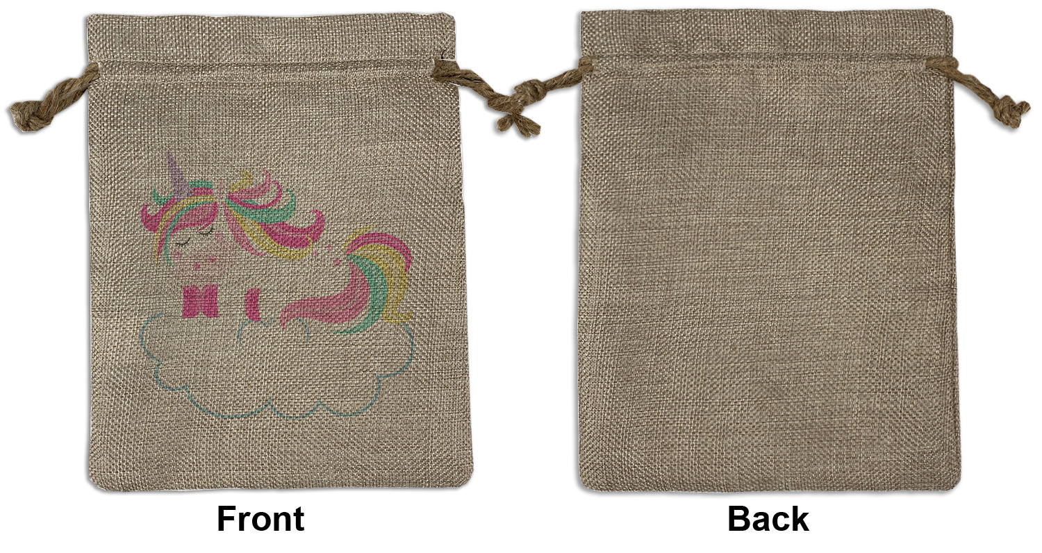 We sell our Burlap Gift Bags in 3 variant sized bags. Made with burlap polyester, each personalized bag can be secured with a twine drawstring pull. Your custom design is available to print on one side or both sides - completely up to you! The sizes of the bags measure approximately 4.5" x 6.5" for the smallest size, 6.5" x 8.0" for the medium size, and 6.5" x 13.5" for the large-sized bag.