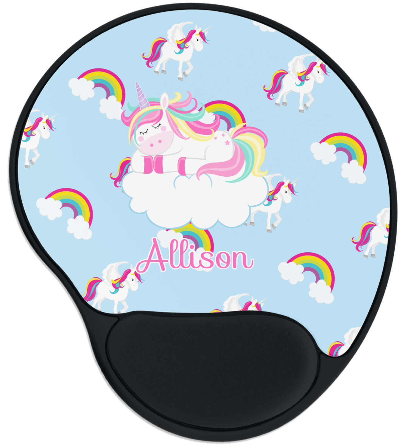 The top of these personalized mouse pads are made from a polyester, while the underside is plastic. The back of these mouse mats include rubber feet to prevent any slippage while in use. A padded wrist support, made from plush memory foam, occupies the bottom section of these computer mouse pads. Your customized design is printed onto the face of this mat, with the remaining sides and support piece colored in black. The mat itself is rounded and measures at 10.25" x 9.13".