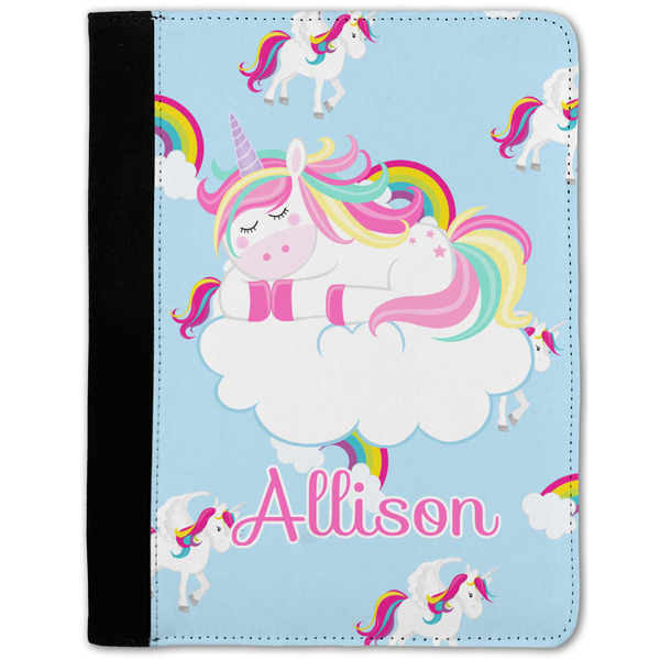 These personalized padfolios are made from a black, polyester microfiber and features a standard, 50-page notepad. However, these black padfolios can accommodate a pad with up to 100 pages. This model also features a slot pocket for any loose sheets of paper, small pockets for business cards, and an elastic band to secure a pen. We print your personalization across the front of this notepad portfolio in bright, vibrant color. These padfolios come in 2 sizes, Medium - approximately 10.25" x 8" for 5" x 8" paper and Large - approximately 12.5" x 8.5" for 8.5" x 11" paper.