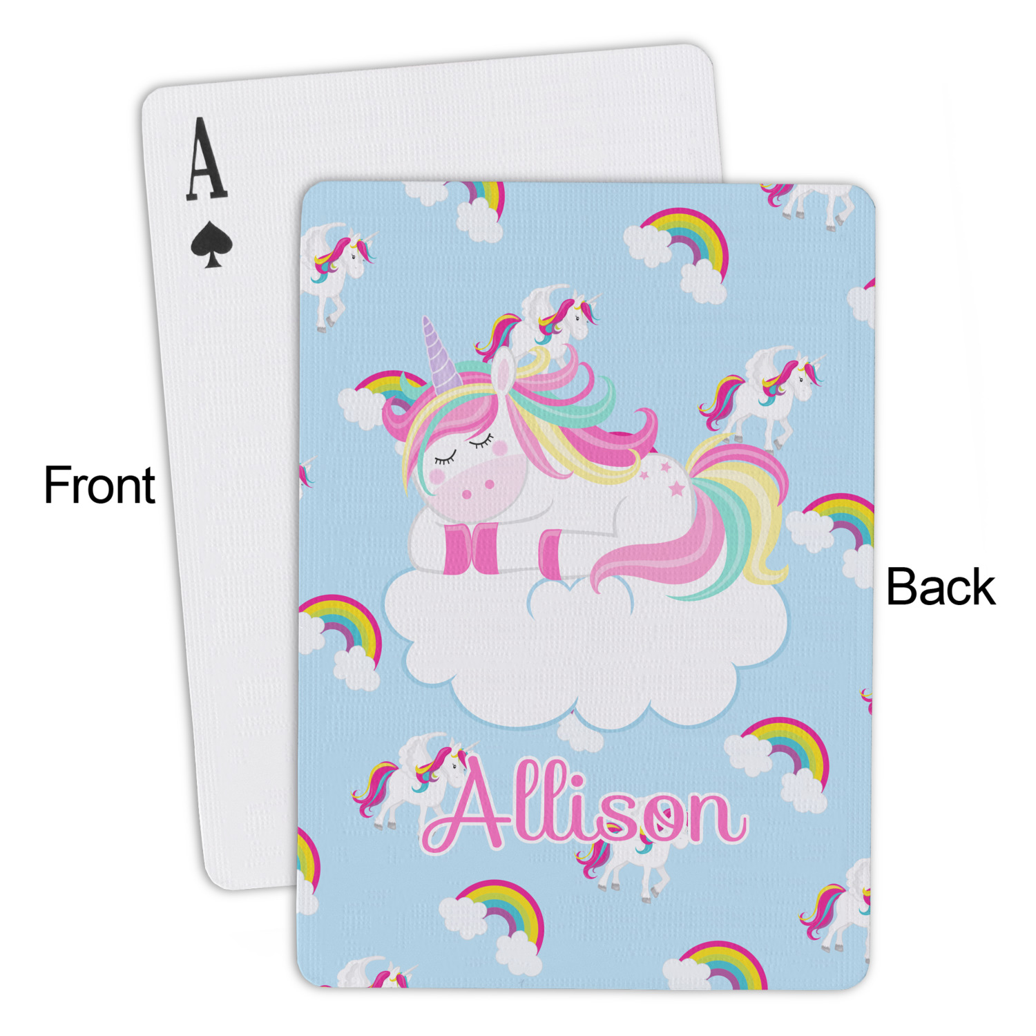 The customization / personalization is printed on the back side. The playing cards have a low gloss coating on both sides. The cards are packaged in a clear plastic box.