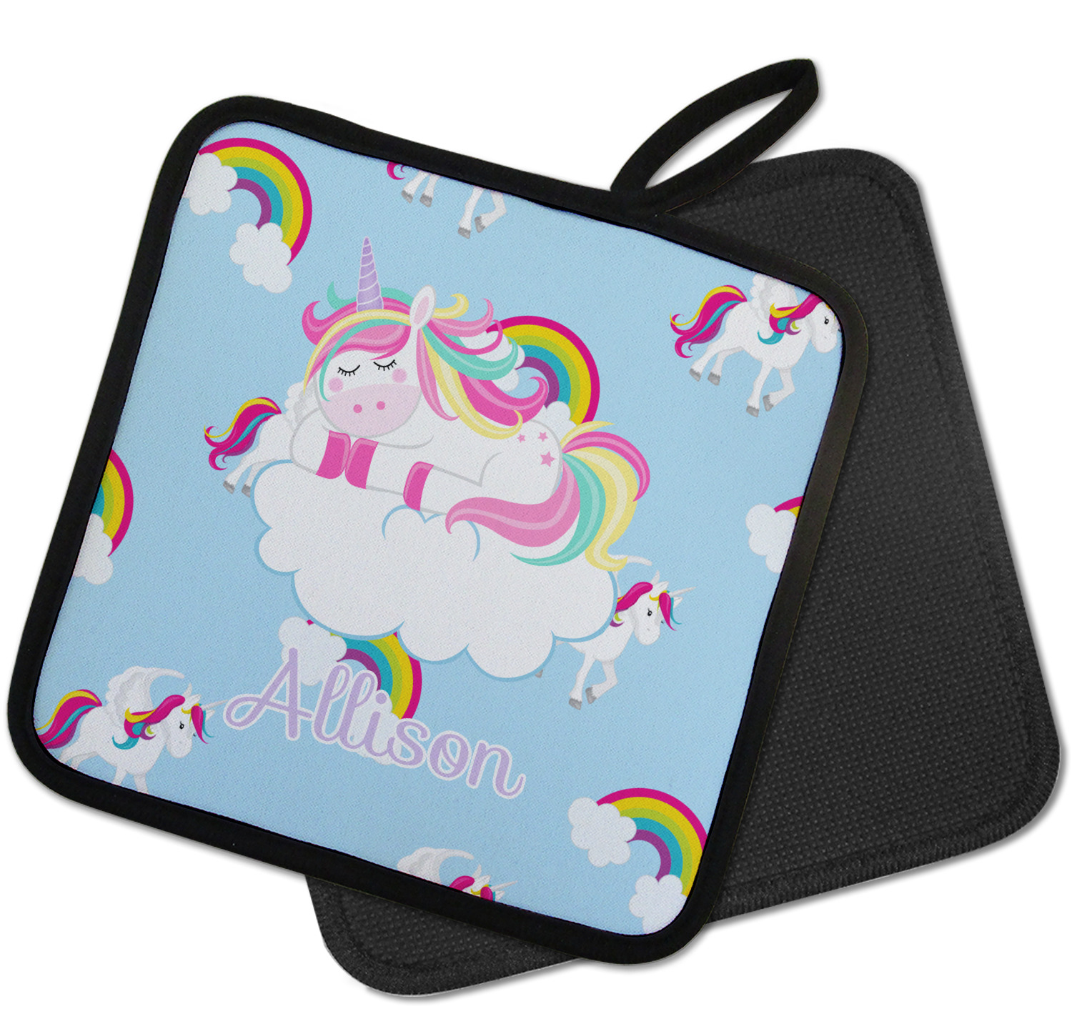 Our personalized pot holders feature a neoprene front that displays your personalization in vibrant colors. The backing of the hot pot holder is rubberized; the textured backing allows you to have a great grip when using this custom pot holder. The two materials are joined with a sleek, black trim, and the holder also includes an attached loop for hanging and storage. The pot holder is approximately 8.75 inches by 8.75 inches and 0.25 inches tall, while the fabric loop is 2.5 inches long. You can purchase a kitchen pot holder by itself or as a set of 2. We also offer a set including one pot holder and one oven mitt.