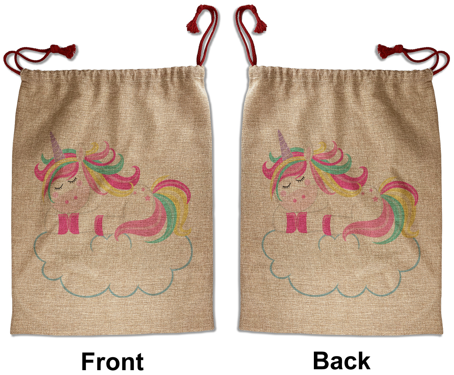 Our Santa sacks print your design on the burlap material giving it a nice rustic, natural design! The burlap material is also machine washable and wrinkle-free, so feel free to fold and store out Santa bags until the next time you need it! Secure your gifts with our red accent drawstring ties at the top of the sack so the mystery of your gift stays a surprise until Christmas day. We offer two types of printing- one side partial print or double-sided partial printing. Design and personalize your own Santa sack in time for the holidays!