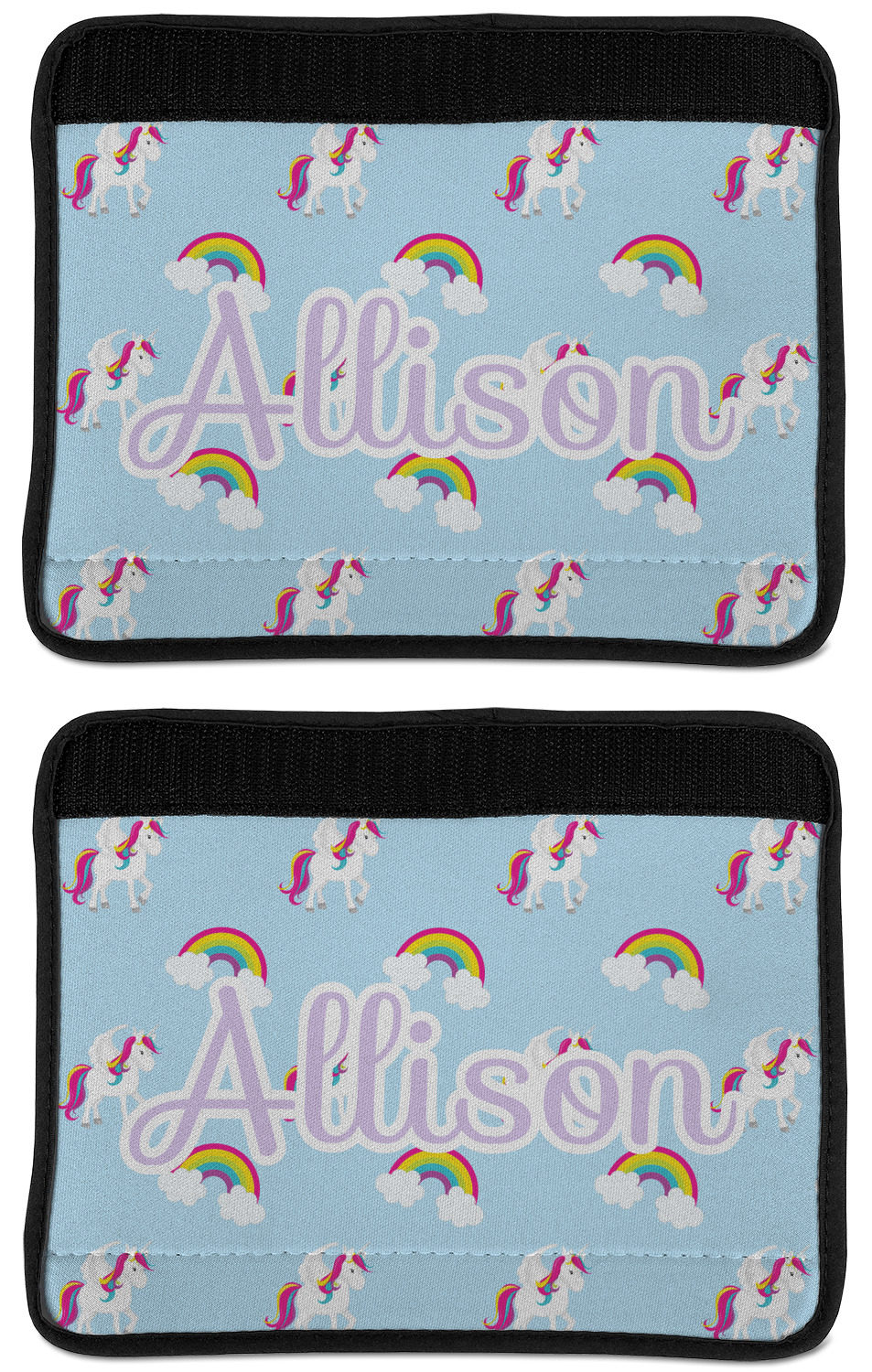 Made from neoprene, our seat belt strap covers wrap around the belt itself and have a Velcro tab for easy attachment and closure. The belt's edges are trimmed with a black polyester for a secure finish. Each cover is 9.5 by 7 inches when open and 9.5 by 2.5 inches when closed. We print your personalized design on the face of the seat belt pad.