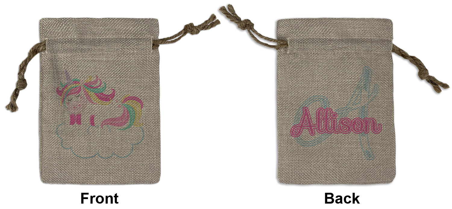 We sell our Burlap Gift Bags in 3 variant sized bags. Made with burlap polyester, each personalized bag can be secured with a twine drawstring pull. Your custom design is available to print on one side or both sides - completely up to you! The sizes of the bags measure approximately 4.5" x 6.5" for the smallest size, 6.5" x 8.0" for the medium size, and 6.5" x 13.5" for the large-sized bag.