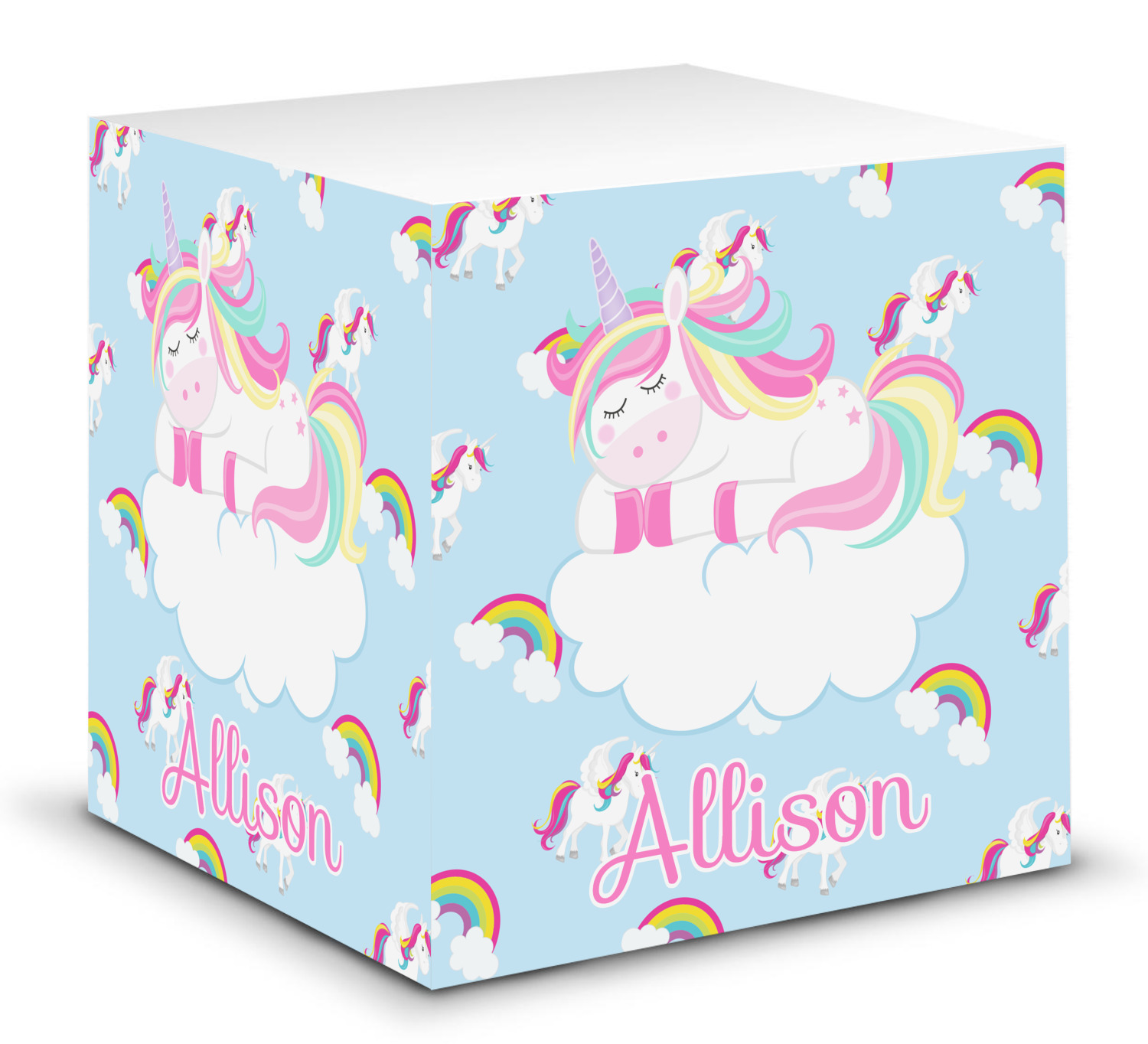 This note cube features 700 sheets of matte, white paper. Each sheet measures at 3.5 by 3.5 inches and has an adhesive strip at its top. Your personalized design is displayed on all four edges of the sticky pad.