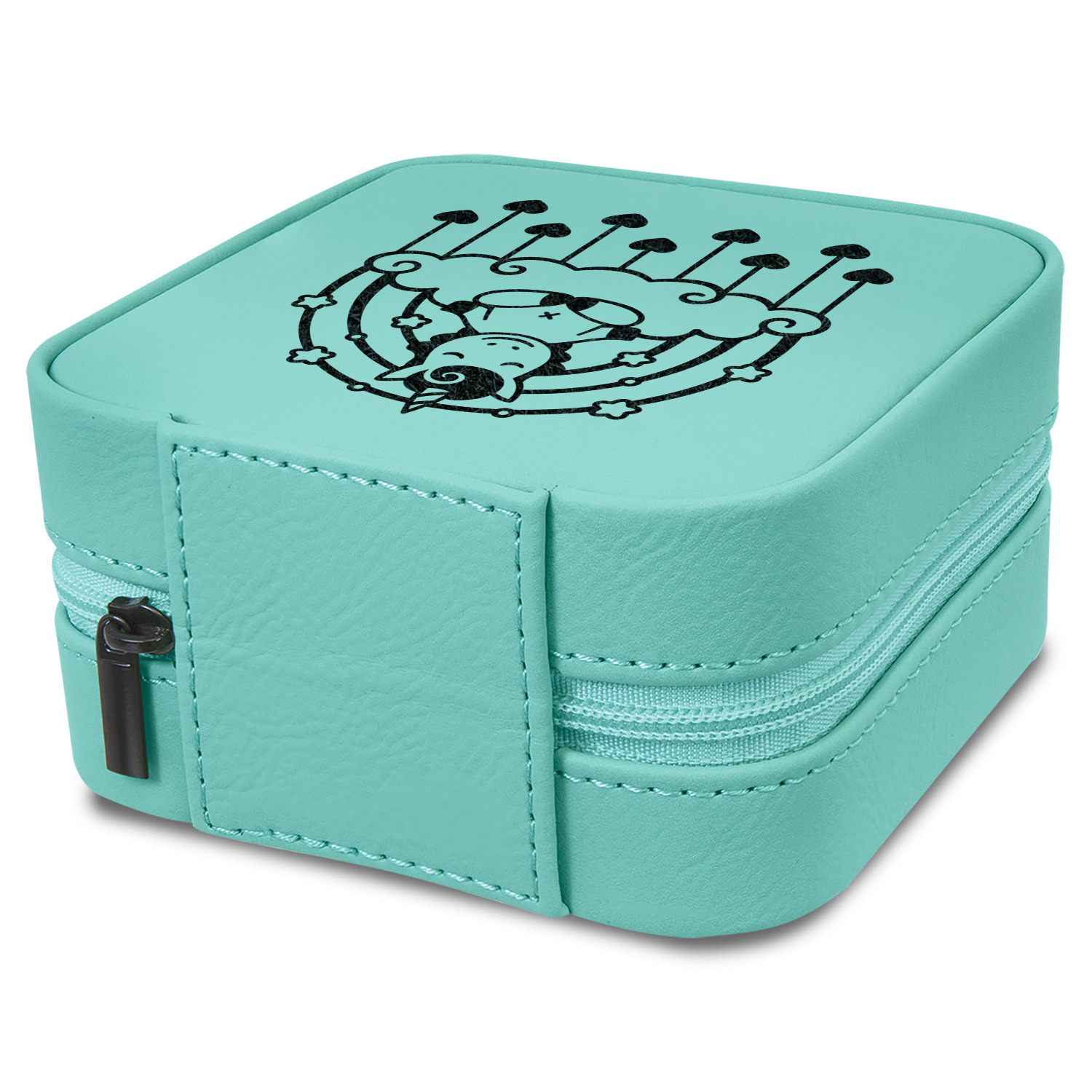 This square zippered travel jewelry box is made from leatherette and is available in four colors - classic cognac / rawhide, a beautiful teal. navy blue or pink. The tan colored soft velvet inside has compartments and hooks for all your jewelry - rings, chains, earrings, bangles etc.