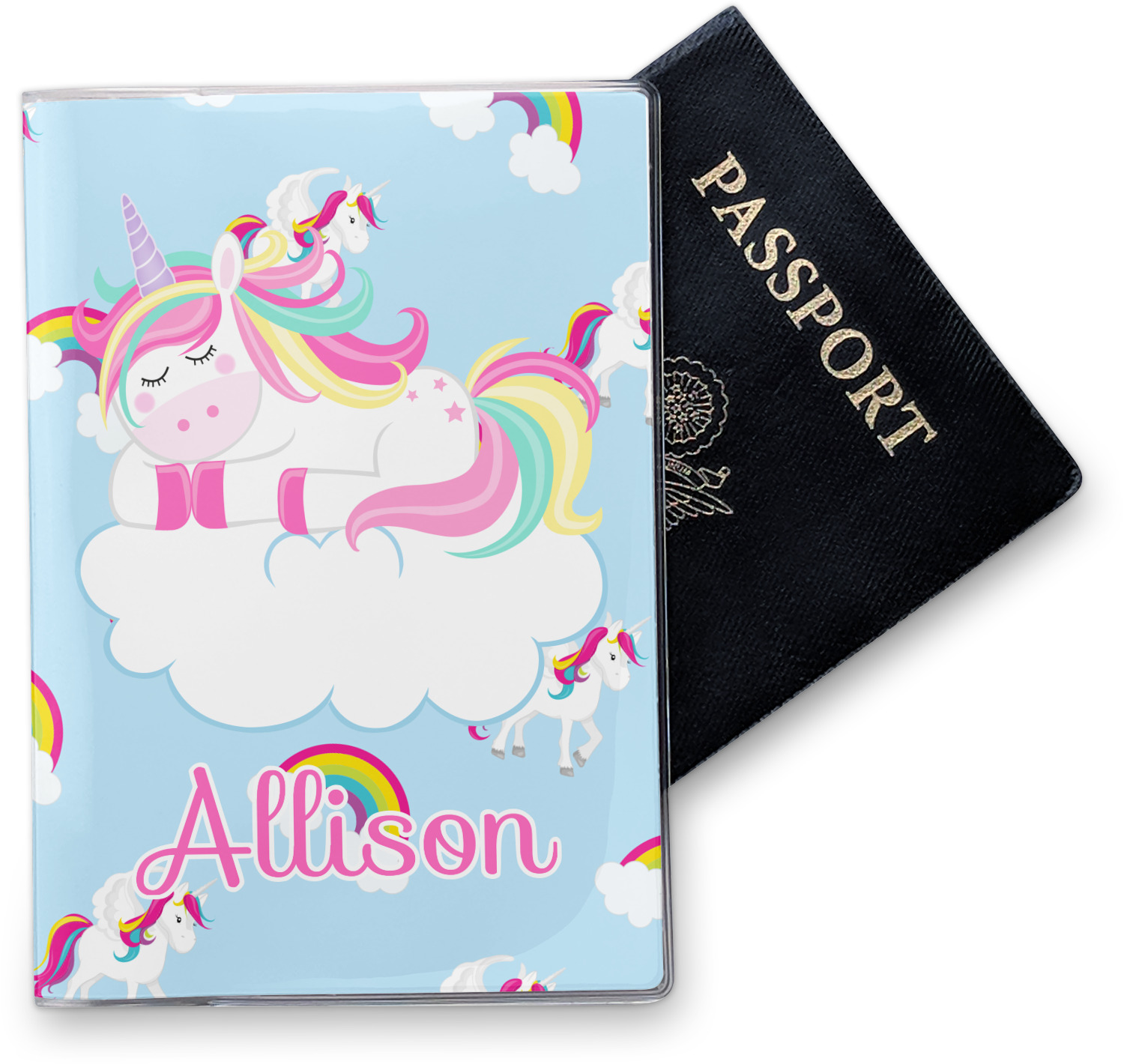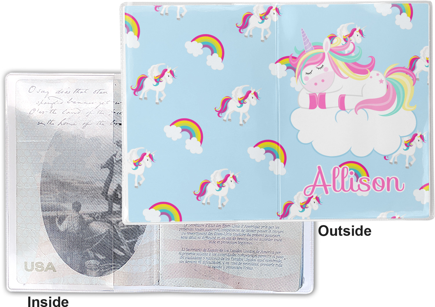 This cover is made of a sturdy clear vinyl with a personalized vinyl insert inside. There is a large and a small pocket on either side to hold the covers of your passport easily and firmly. The passport holder is approximately 7.5" x 5.25", the perfect size to snugly fit your passport. This slim cover is the perfect way to protect your passport without being one more bulky item you have to carry.