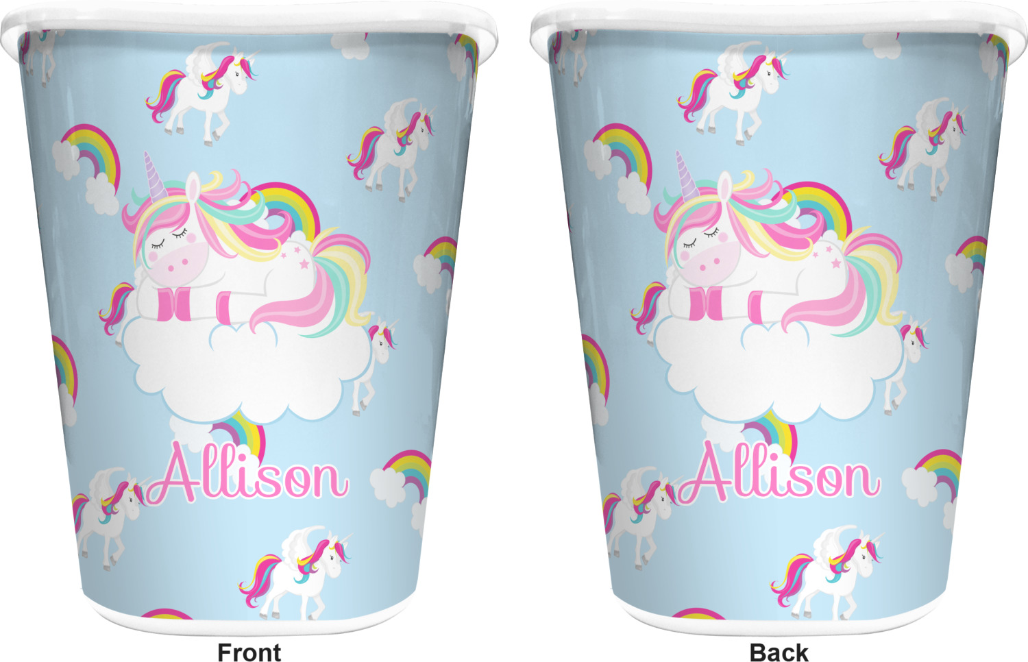 You can choose to purchase these decorative wastebaskets in either a white or a black color that will show on the base and the upper rim. Your customization is printed on a high-gloss, fine-quality vinyl adhesive, and you can choose to either have this adhesive applied to one side only or to both sides. As such, this plastic wastebasket can be single-sided or double-sided, depending on your creative vision. Your customization is printed using durable inks, making the design waterproof and resistant to fading over time.