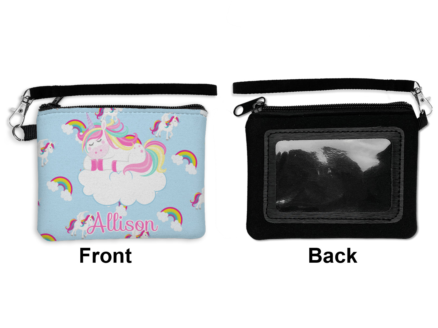 This personalized ID holder wallet comes with an ID window thats separated from the main compartment. With a zipper closure and a lobster claw clasp keychain to stay on your wrist, youll never have to worry about losing your contents or your entire wallet.