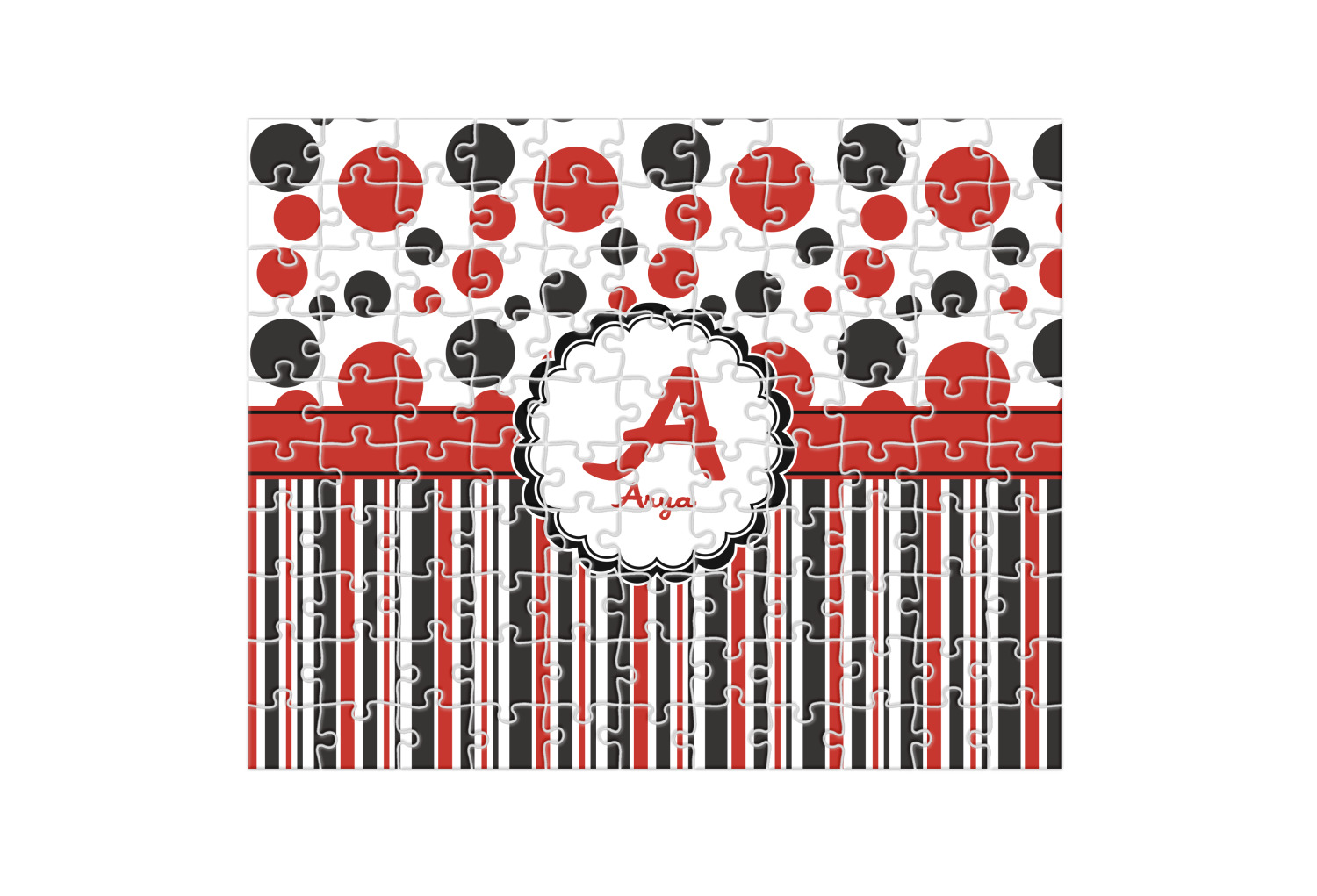 The classic red, black, and white color scheme has been revived with a touch of fun. The top part of this design if filled with different shaped polka dots in black and red that pop on a white background. The bottom half of the design has coordinating colored stripes that complete this fun look.