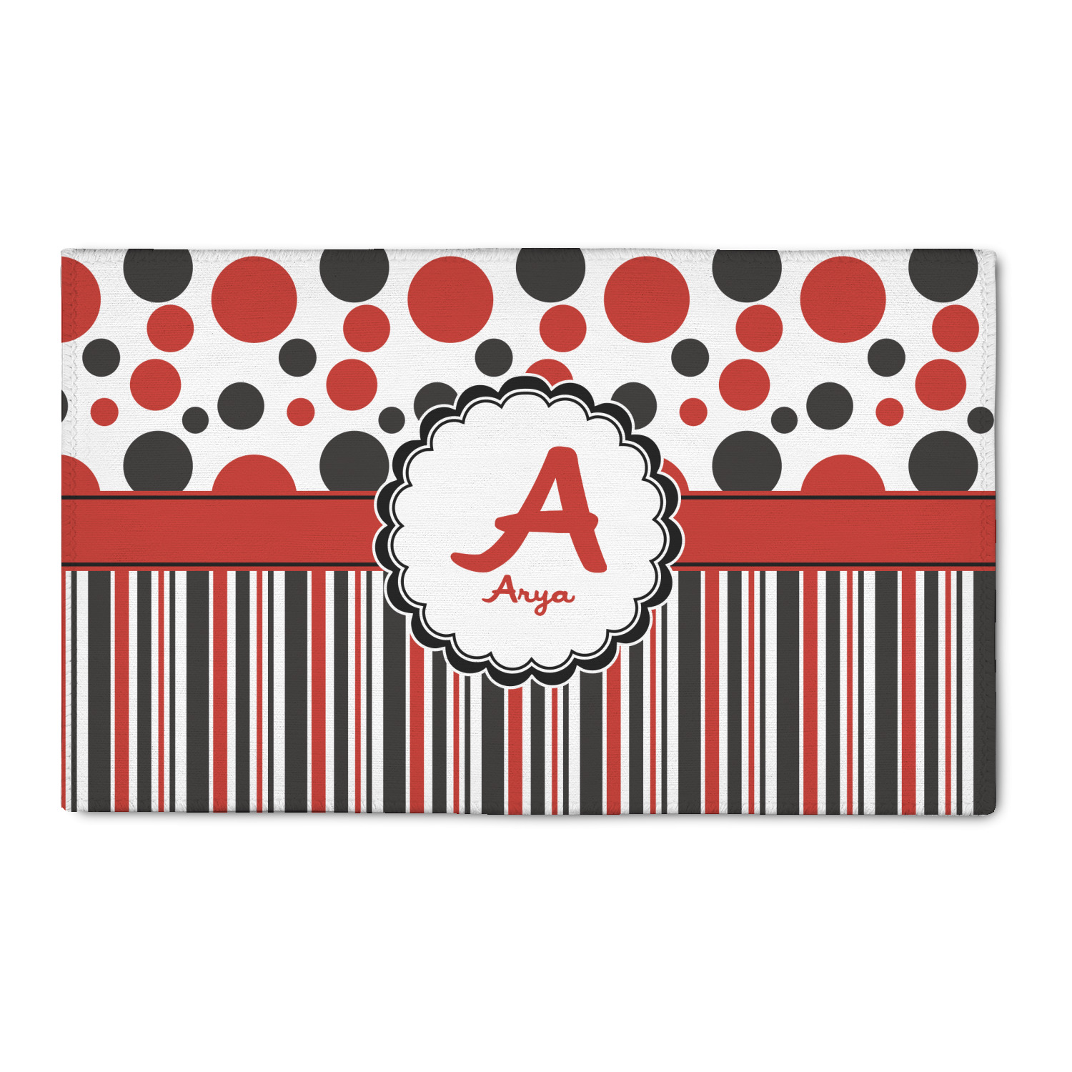 The classic red, black, and white color scheme has been revived with a touch of fun. The top part of this design if filled with different shaped polka dots in black and red that pop on a white background. The bottom half of the design has coordinating colored stripes that complete this fun look.