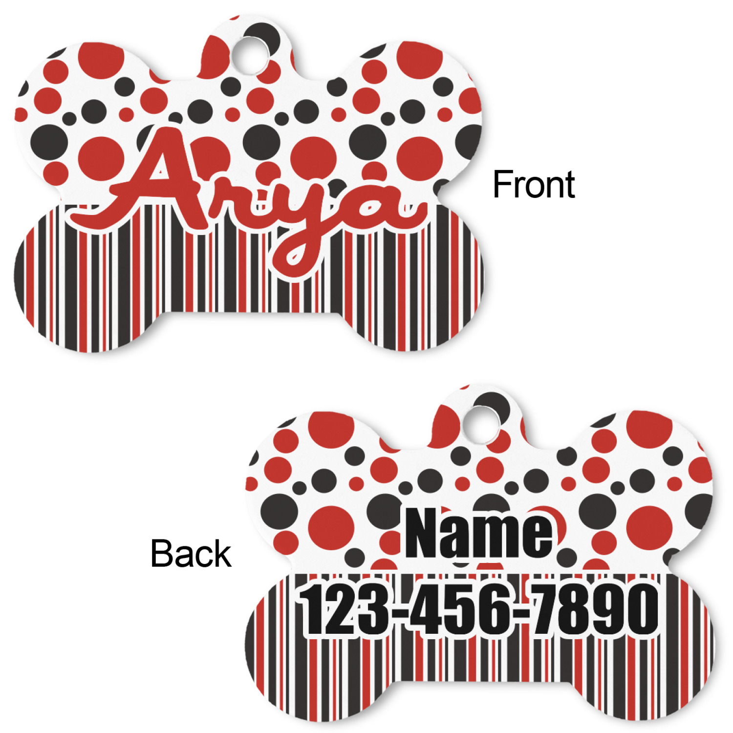 Our default design templates print your dog's personalization on the front and your contact information on the back; however everything is customizable, so you customize the patterns, the colors, the personalization, the contact information etc.