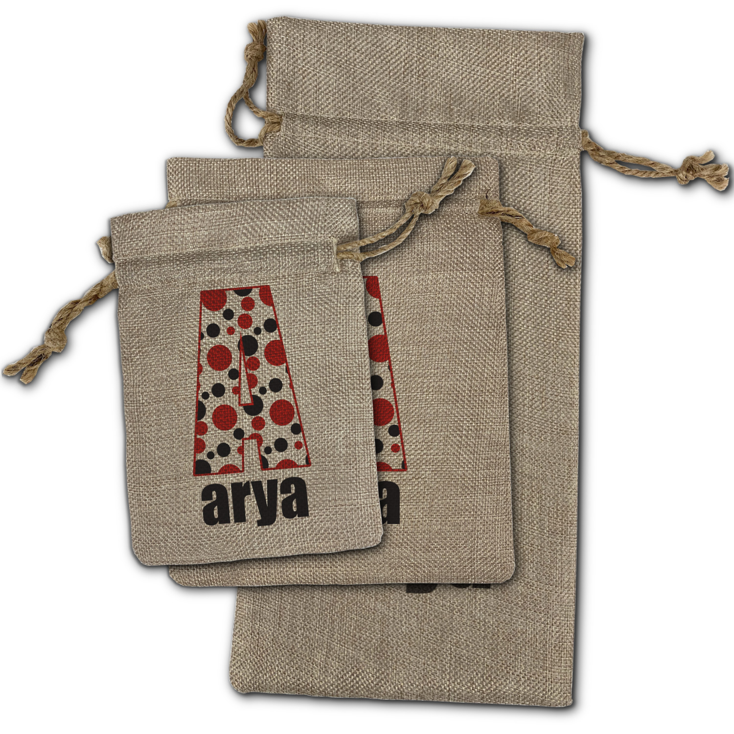 We sell our Burlap Gift Bags in 3 variant sized bags. Made with burlap polyester, each personalized bag can be secured with a twine drawstring pull. Your custom design is available to print on one side or both sides - completely up to you! The sizes of the bags measure approximately 4.5" x 6.5" for the smallest size, 6.5" x 8.0" for the medium size, and 6.5" x 13.5" for the large-sized bag.