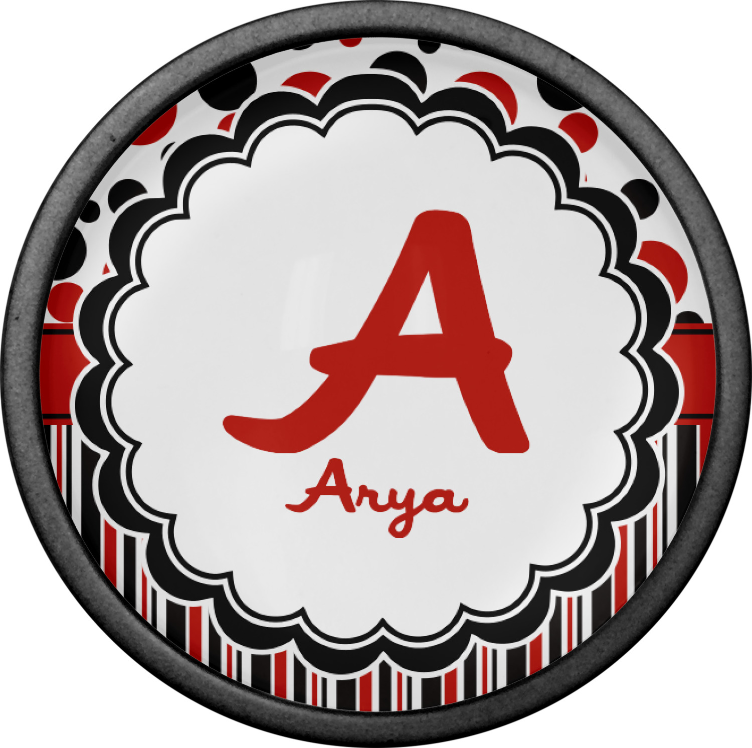 A wide red band with an inset of black trim add the perfect backdrop for the white scalloped circle label that is edged with double rows of black. This label provides the perfect area for personalization of your choice.