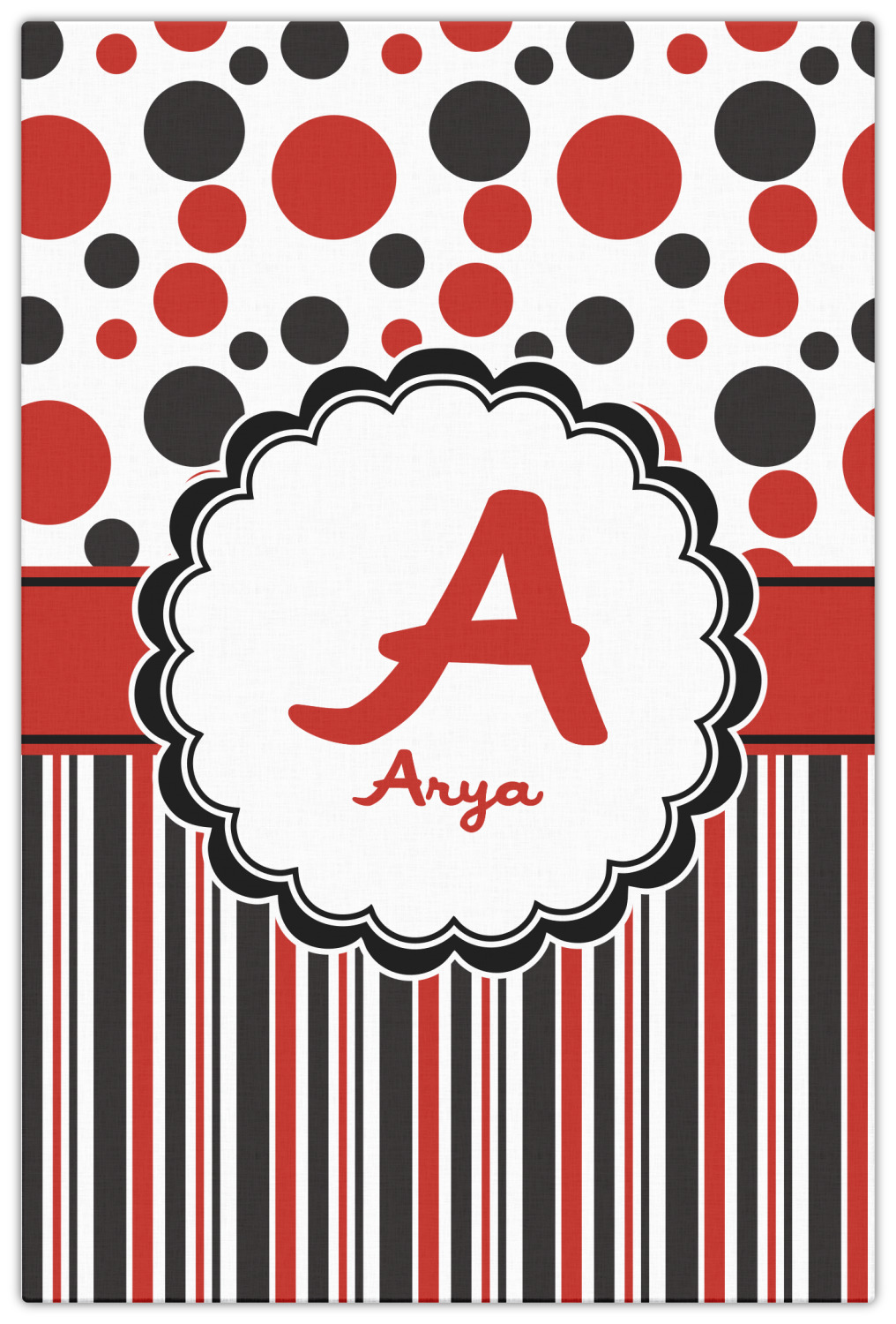 The classic red, black, and white color scheme has been revived with a touch of fun. The top part of this design if filled with different shaped polka dots in black and red that pop on a white background. The bottom half of the design has coordinating colored stripes that complete this fun look.