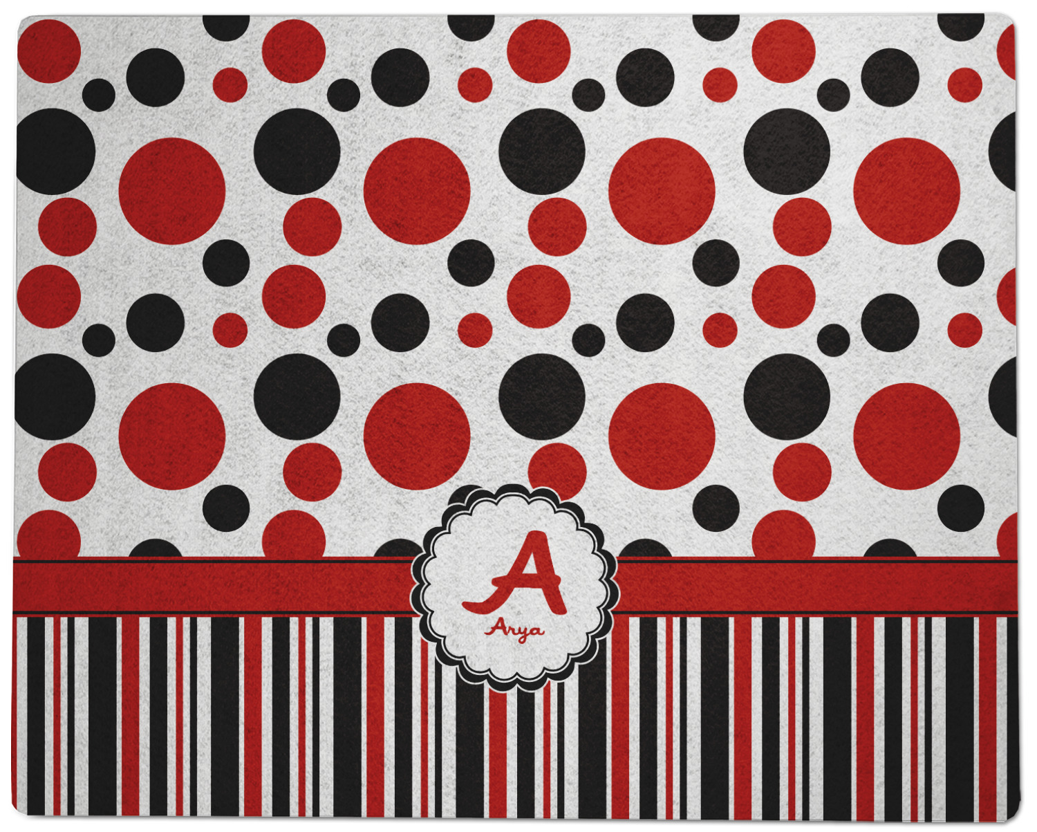 The classic red, black, and white color scheme has been revived with a touch of fun. The top part of this design if filled with different shaped polka dots in black and red that pop on a white background. The bottom half of the design has coordinating colored stripes that complete this fun look.