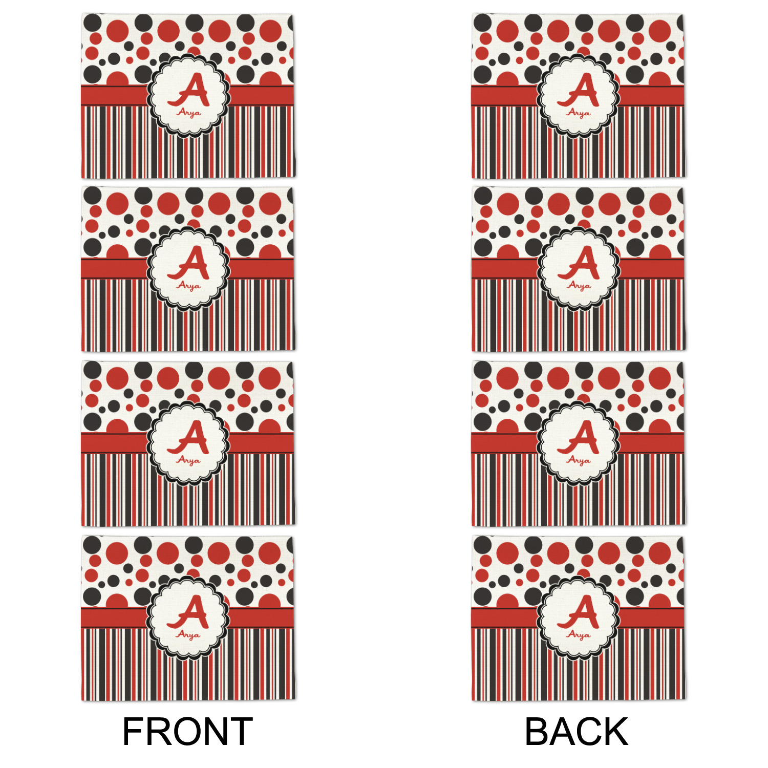 The classic red, black, and white color scheme has been revived with a touch of fun. The top part of this design if filled with different shaped polka dots in black and red that pop on a white background. The bottom half of the design has coordinating colored stripes that complete this fun look.