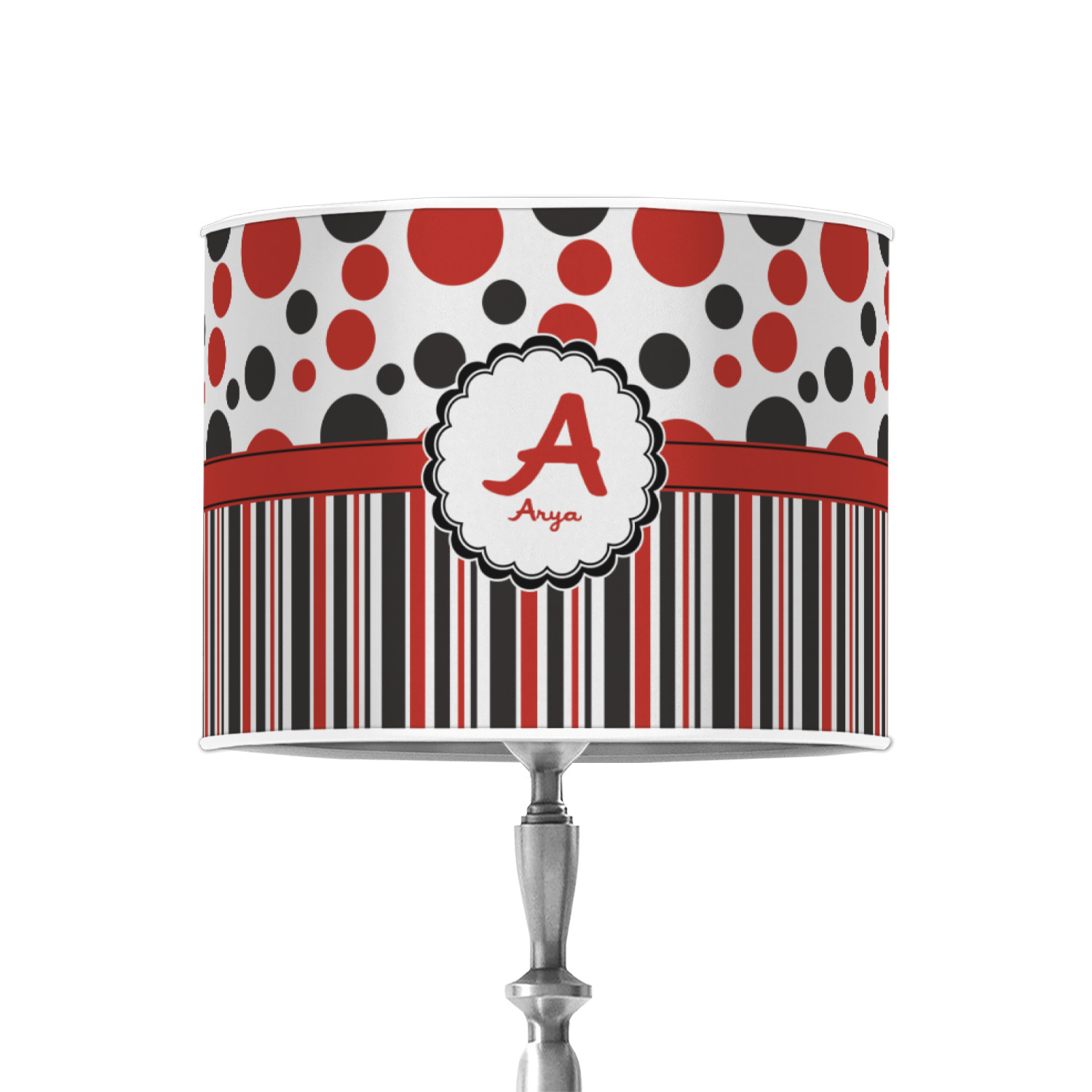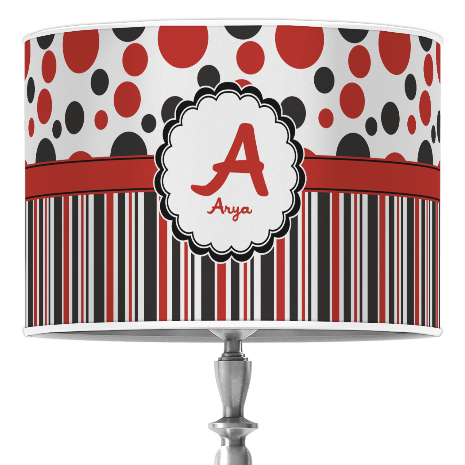 The classic red, black, and white color scheme has been revived with a touch of fun. The top part of this design if filled with different shaped polka dots in black and red that pop on a white background. The bottom half of the design has coordinating colored stripes that complete this fun look.