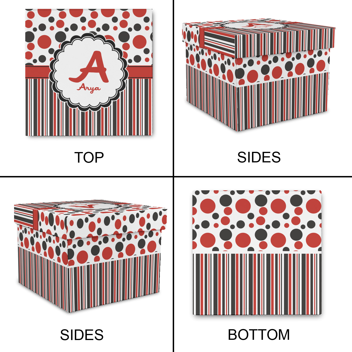 The classic red, black, and white color scheme has been revived with a touch of fun. The top part of this design if filled with different shaped polka dots in black and red that pop on a white background. The bottom half of the design has coordinating colored stripes that complete this fun look.
