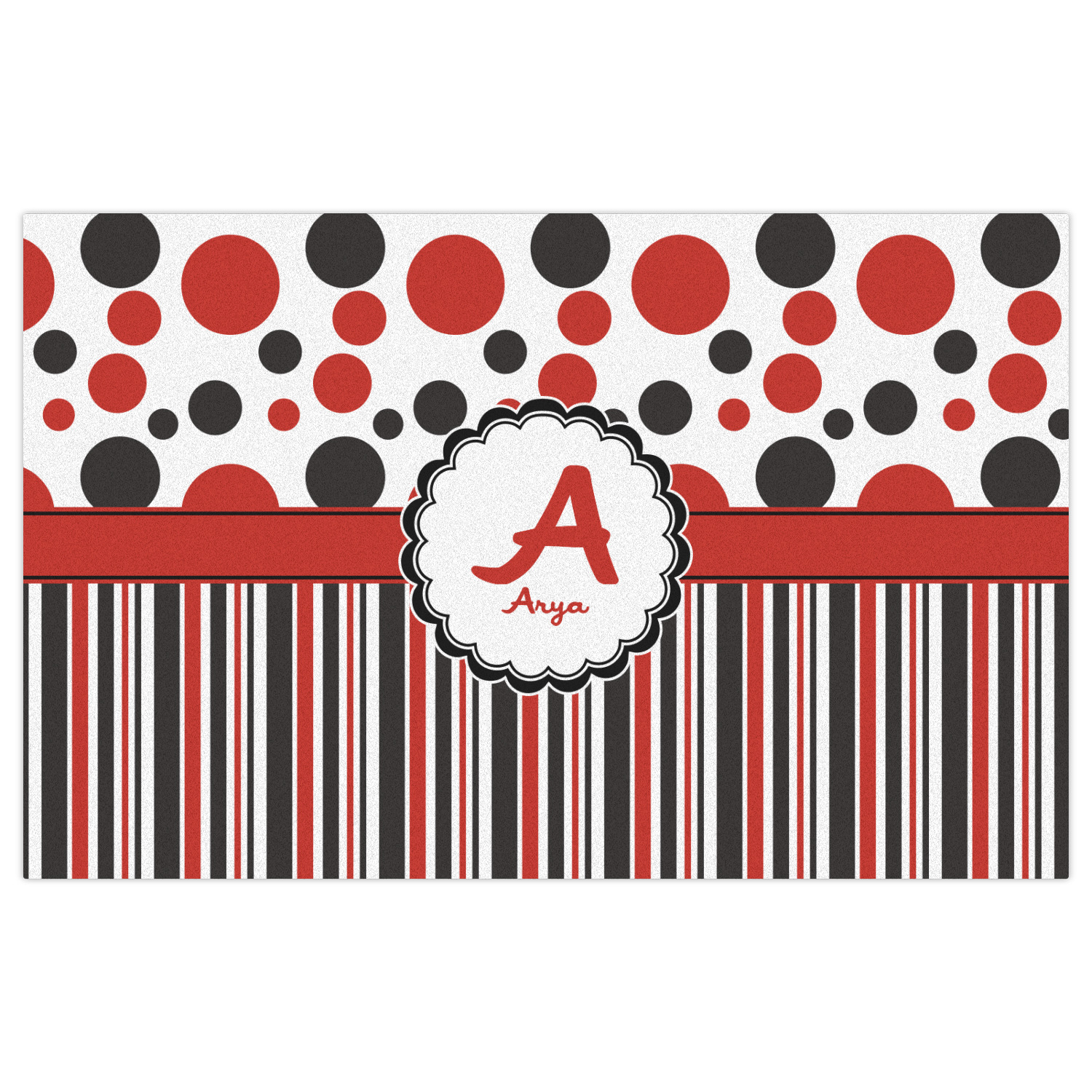 The classic red, black, and white color scheme has been revived with a touch of fun. The top part of this design if filled with different shaped polka dots in black and red that pop on a white background. The bottom half of the design has coordinating colored stripes that complete this fun look.