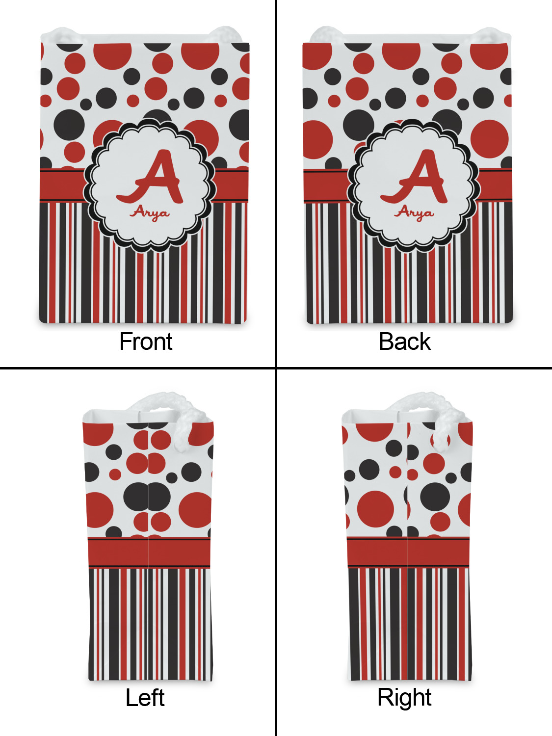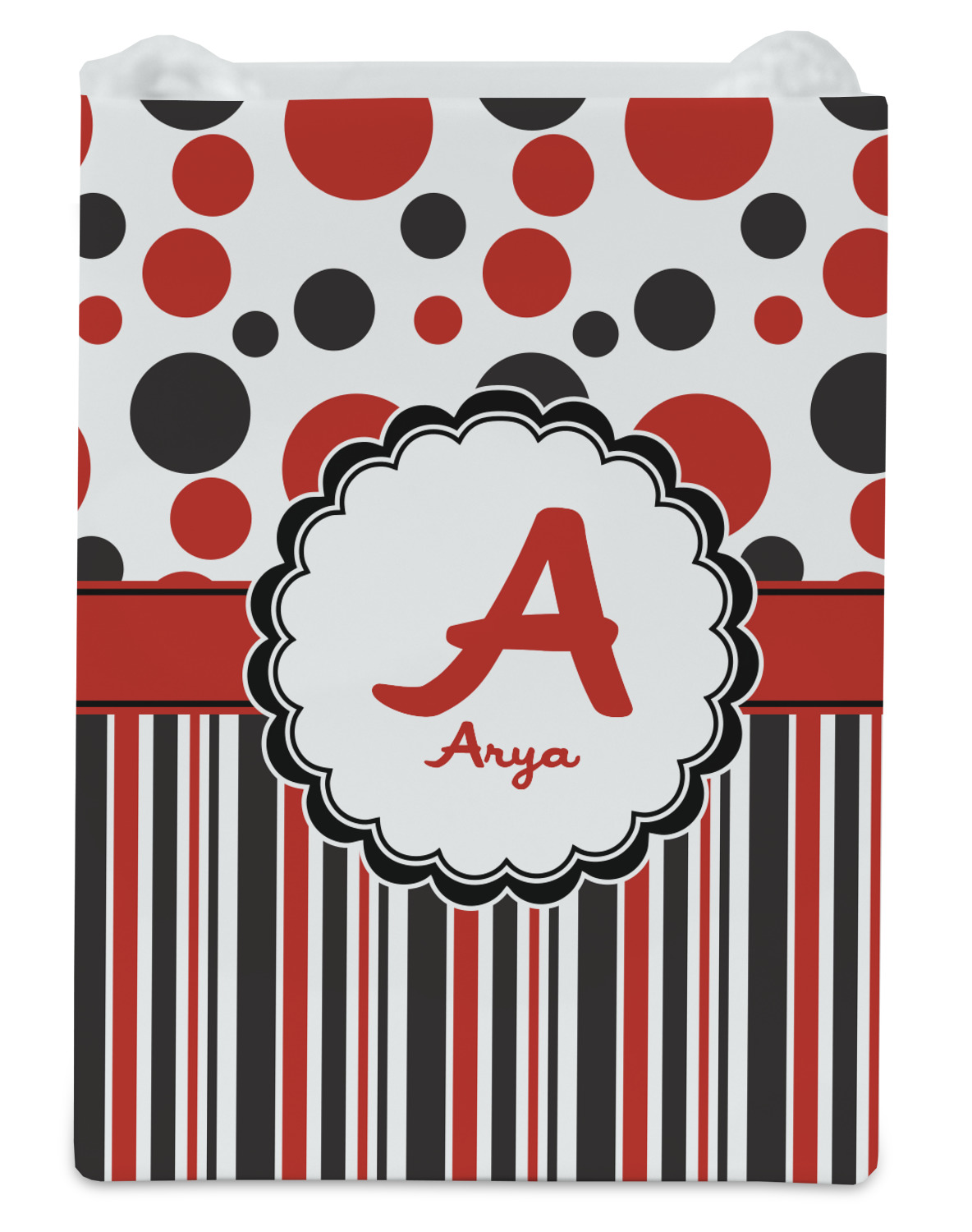 The classic red, black, and white color scheme has been revived with a touch of fun. The top part of this design if filled with different shaped polka dots in black and red that pop on a white background. The bottom half of the design has coordinating colored stripes that complete this fun look.