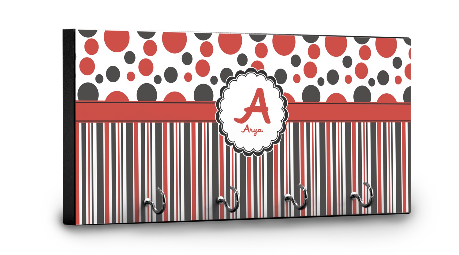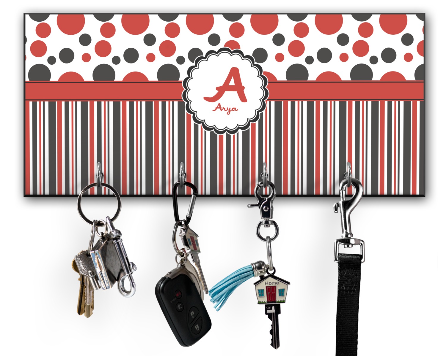 This 11" x 5" key hanger is made of sturdy wood and has four metal hooks lining the bottom. This is the perfect size for a family with several drivers. Not only can you hang keys on it though, but pet leashes and other small items. The board is black on the sides and back and is printed with the design of your choice on the front.