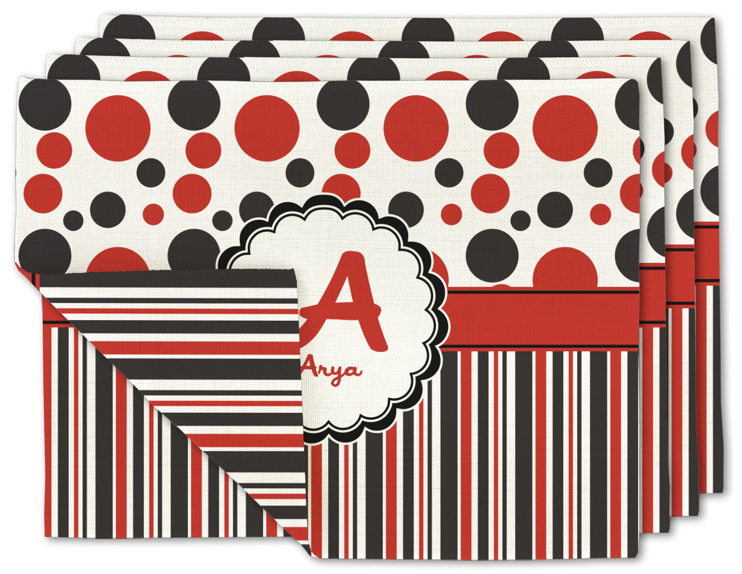 The classic red, black, and white color scheme has been revived with a touch of fun. The top part of this design if filled with different shaped polka dots in black and red that pop on a white background. The bottom half of the design has coordinating colored stripes that complete this fun look.