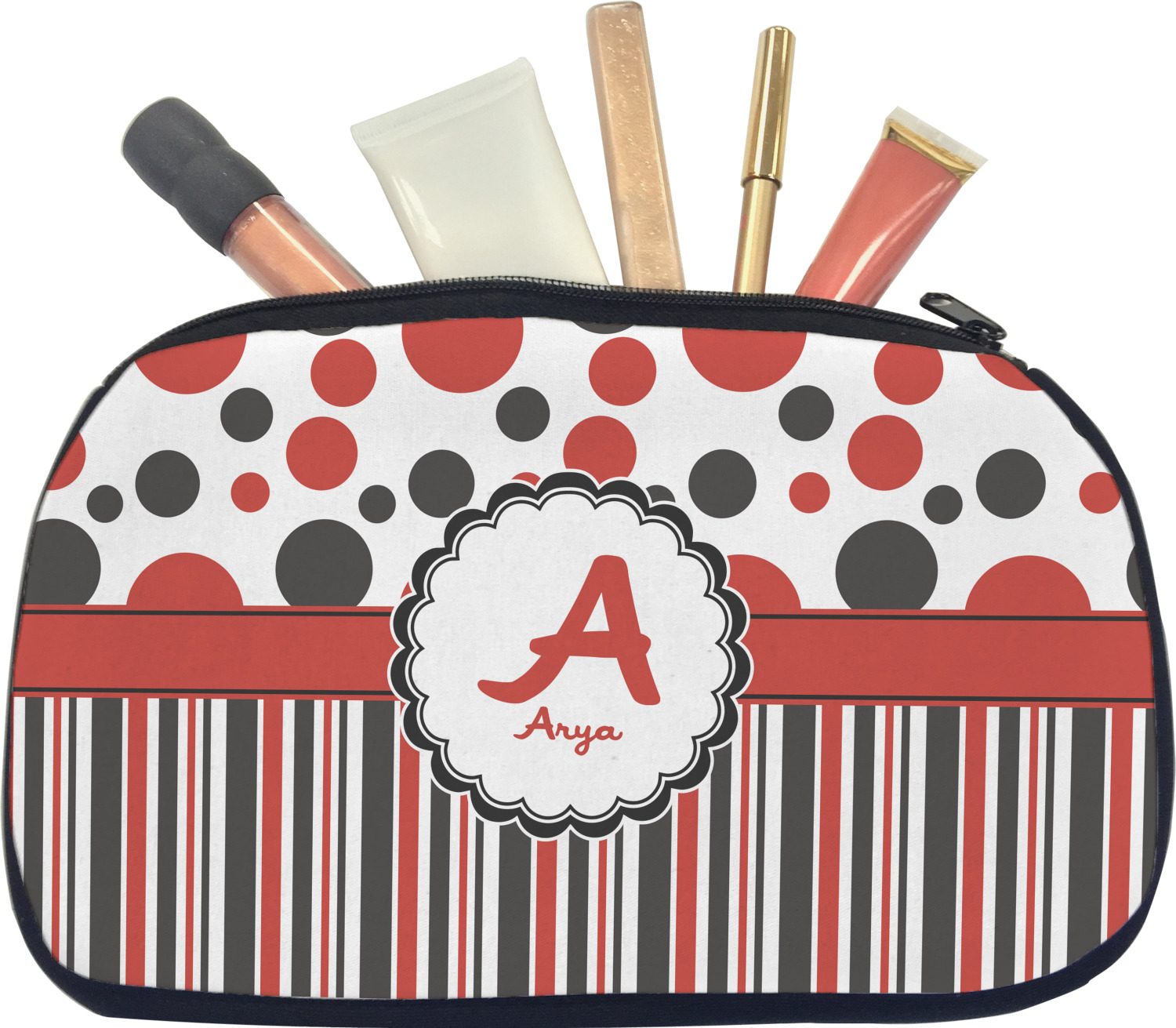 Our personalized makeup bags are available in many different designs, patterns and colors - so you are sure to find one that will love. They are made of neoprene (same material as wet-suits) and thus are water resistant, so spillages in your makeup bag will not end up all over you purse. They are customized on one side and are black on the other side and the zipper is black as well.