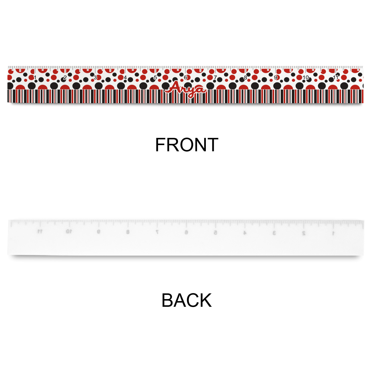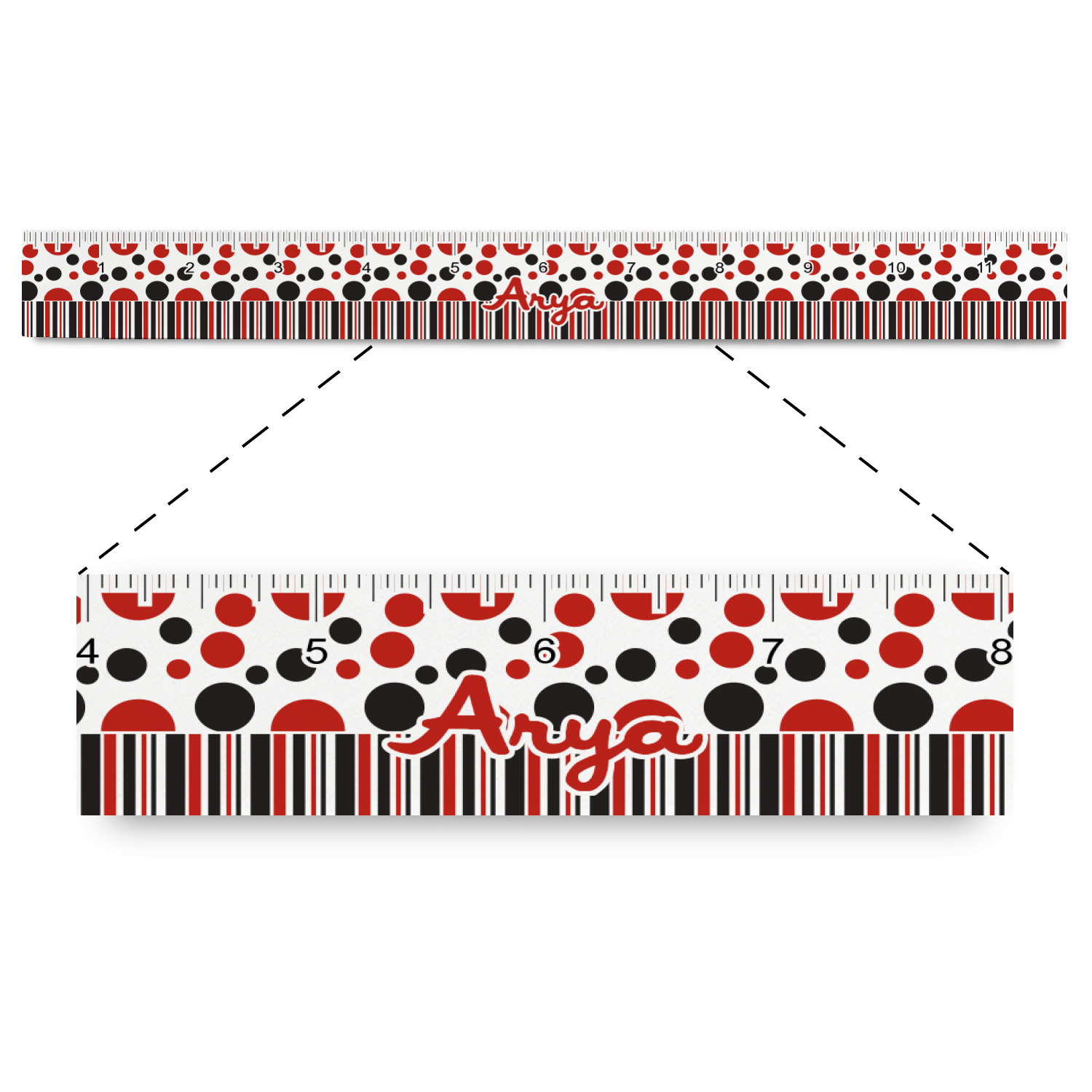 The classic red, black, and white color scheme has been revived with a touch of fun. The top part of this design if filled with different shaped polka dots in black and red that pop on a white background. The bottom half of the design has coordinating colored stripes that complete this fun look.