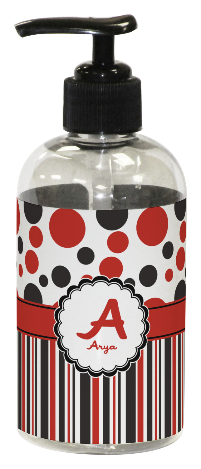 Our bottle dispensers are clear plastic with a black or white nozzle and are available in two sizes - 8 oz (2.25"D x 6"H) and 16 oz (2.5"D x 7"H) and can hold a variety of liquids. The large size (16 oz) is perfect for shampoo, conditioner, body soap / lotion while the smaller size (8 oz) is perfect for hand soap, lotion or face cleanser.